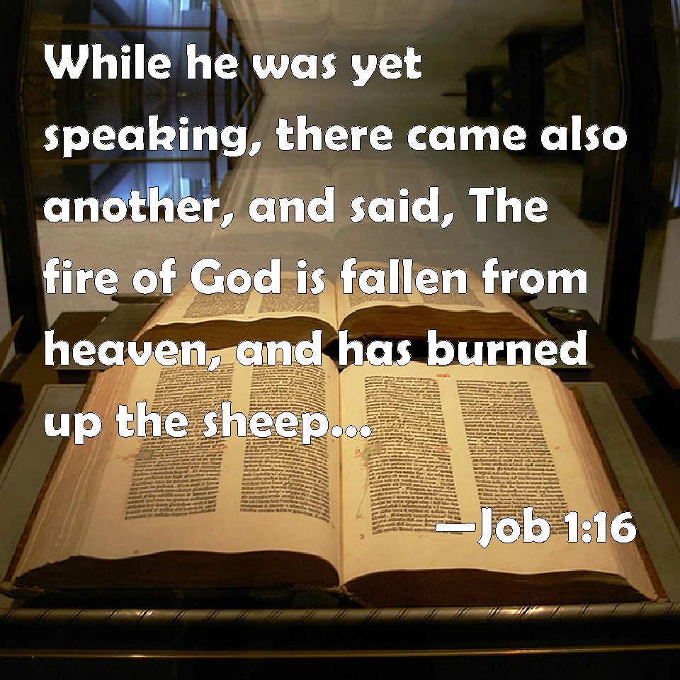 Choose a Background Job 1:16 While he was yet speaking, there came also another, and said, The fire of God is fallen from heaven, and has burned up the sheep, and the servants, and consumed them; and I only am escaped alone to tell you. KJV: While he was yet speaking, there came also another, and said, The fire of God is fallen from heaven, and hath burned up the sheep, and the servants, and consumed them; and I only am escaped alone to tell thee. DRB: And while he was yet speaking, another came, and said: The fire of God fell from heaven, and striking the sheep and the servants, hath consumed them, and I alone have escaped to tell thee. DBT: While he was yet speaking, there came another and said, The fire of God fell from heaven and burned up the sheep and the servants, and consumed them; and I only am escaped, alone, to tell thee. ERV: While he was yet speaking, there came also another, and said, The fire of God is fallen from heaven, and hath burned up the sheep, and the servants, and consumed them; and I only am escaped alone to tell thee. WBT: While he was yet speaking, there came also another, and said, The fire of God hath fallen from heaven, and hath burned up the sheep and the servants, and consumed them; and I only have escaped alone to tell thee. WEB: While he was still speaking, there also came another, and said, "The fire of God has fallen from the sky, and has burned up the sheep and the servants, and consumed them, and I alone have escaped to tell you." YLT: While this one is speaking another also hath come and saith, 'Fire of God hath fallen from the heavens, and burneth among the flock, and among the young men, and consumeth them, and I am escaped — only I alone — to declare it to thee.'Links Job 1:16 NIV • Job 1:16 NLT • Job 1:16 ESV • Job 1:16 NASB • Job 1:16 KJV • Job 1:16 Interlinear • Job 1:16 Commentaries • Job 1:16 Parallel Texts • Job 1:16 Bible Apps • Job 1:16 Parallel • Bible Hub |