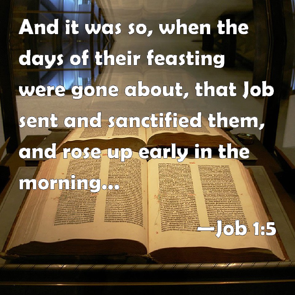 Choose a Background Job 1:5 And it was so, when the days of their feasting were gone about, that Job sent and sanctified them, and rose up early in the morning, and offered burnt offerings according to the number of them all: for Job said, It may be that my sons have sinned, and cursed God in their hearts. Thus did Job continually. KJV: And it was so, when the days of their feasting were gone about, that Job sent and sanctified them, and rose up early in the morning, and offered burnt offerings according to the number of them all: for Job said, It may be that my sons have sinned, and cursed God in their hearts. Thus did Job continually. DRB: And when the days of their feasting were gone about, Job sent to them, and sanctified them: and rising up early offered holocausts for every one of them. For he said: Lest perhaps my sons have sinned, and have blessed God in their hearts. So did Job all days. DBT: And it was so, when the days of the feasting were gone about, that Job sent and hallowed them; and he rose up early in the morning, and offered up burnt-offerings according to the number of them all; for Job said, It may be that my children have sinned, and cursed God in their hearts. Thus did Job continually. ERV: And it was so, when the days of their feasting were gone about, that Job sent and sanctified them, and rose up early in the morning, and offered burn offerings according to the number of them all: for Job said, It may be that my sons have sinned, and renounced God in their hearts. Thus did Job continually. WBT: And it was so, when the days of their feasting were ended, that Job sent and sanctified them, and rose early in the morning, and offered burnt-offerings according to the number of them all; for Job said, It may be that my sons have sinned, and cursed God in their hearts. Thus did Job continually. WEB: It was so, when the days of their feasting had run their course, that Job sent and sanctified them, and rose up early in the morning, and offered burnt offerings according to the number of them all. For Job said, "It may be that my sons have sinned, and renounced God in their hearts." Job did so continually. YLT: and it cometh to pass, when they have gone round the days of the banquet, that Job doth send and sanctify them, and hath risen early in the morning, and caused to ascend burnt-offerings — the number of them all — for Job said, 'Perhaps my sons have sinned, yet blessed God in their heart.' Thus doth Job all the days.Links Job 1:5 NIV • Job 1:5 NLT • Job 1:5 ESV • Job 1:5 NASB • Job 1:5 KJV • Job 1:5 Interlinear • Job 1:5 Commentaries • Job 1:5 Parallel Texts • Job 1:5 Bible Apps • Job 1:5 Parallel • Bible Hub |