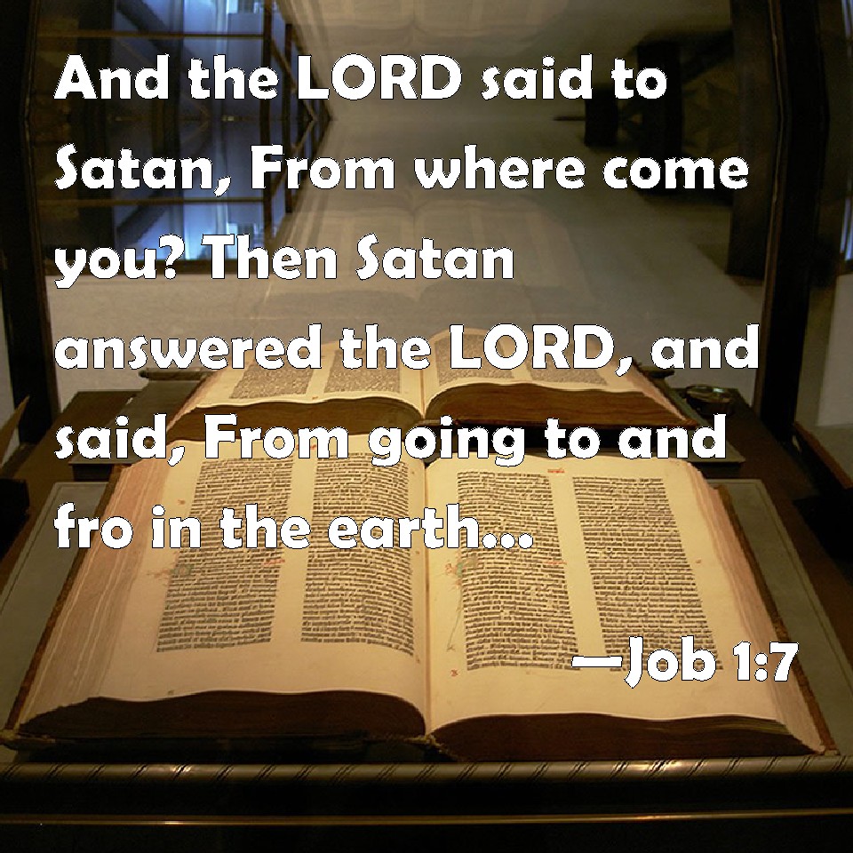 Choose a Background Job 1:7 And the LORD said to Satan, From where come you? Then Satan answered the LORD, and said, From going to and fro in the earth, and from walking up and down in it. KJV: And the LORD said unto Satan, Whence comest thou? Then Satan answered the LORD, and said, From going to and fro in the earth, and from walking up and down in it. DRB: And the Lord said to him: Whence comest thou ? And he answered and said: I have gone round about the earth, and walked through it. DBT: And Jehovah said to Satan, Whence comest thou? And Satan answered Jehovah and said, From going to and fro in the earth, and from walking up and down in it. ERV: And the LORD said unto Satan, Whence comest thou? Then Satan answered the LORD, and said, From going to and fro in the earth, and from walking up and down in it. WBT: And the LORD said to Satan, Whence comest thou? Then Satan answered the LORD, and said, From going to and fro on the earth, and from walking up and down upon it. WEB: Yahweh said to Satan, "Where have you come from?" Then Satan answered Yahweh, and said, "From going back and forth in the earth, and from walking up and down in it." YLT: And Jehovah saith unto the Adversary, 'Whence comest thou?' And the Adversary answereth Jehovah and saith, 'From going to and fro in the land, and from walking up and down on it.'Links Job 1:7 NIV • Job 1:7 NLT • Job 1:7 ESV • Job 1:7 NASB • Job 1:7 KJV • Job 1:7 Interlinear • Job 1:7 Commentaries • Job 1:7 Parallel Texts • Job 1:7 Bible Apps • Job 1:7 Parallel • Bible Hub |