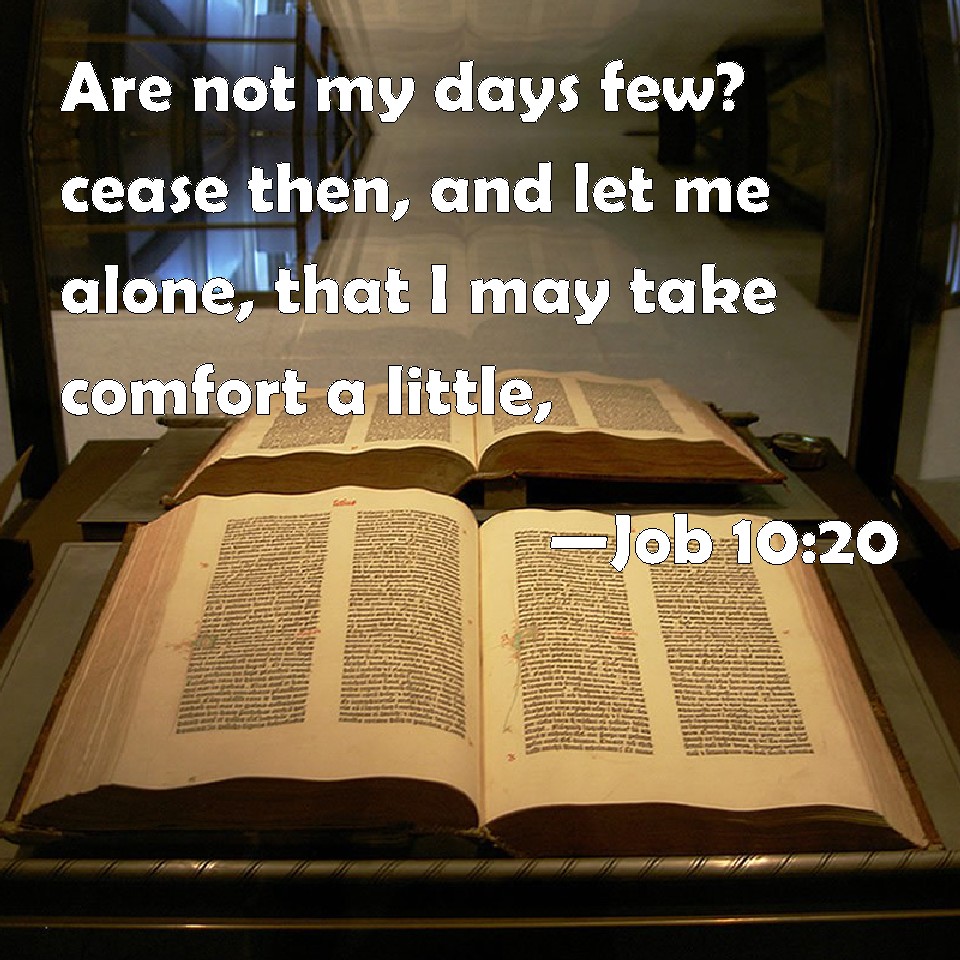 Choose a Background Job 10:20 Are not my days few? cease then, and let me alone, that I may take comfort a little, KJV: Are not my days few? cease then, and let me alone, that I may take comfort a little, DRB: Shall not the fewness of my days be ended shortly? suffer me, therefore, that I may lament my sorrow a little: DBT: Are not my days few? cease then and let me alone, that I may revive a little, ERV: Are not my days few? cease then, and let me alone, that I may take comfort a little, WBT: Are not my days few? cease then, and let me alone, that I may take comfort a little, WEB: Aren't my days few? Cease then. Leave me alone, that I may find a little comfort, YLT: Are not my days few? Cease then, and put from me, And I brighten up a little,Links Job 10:20 NIV • Job 10:20 NLT • Job 10:20 ESV • Job 10:20 NASB • Job 10:20 KJV • Job 10:20 Interlinear • Job 10:20 Commentaries • Job 10:20 Parallel Texts • Job 10:20 Bible Apps • Job 10:20 Parallel • Bible Hub |