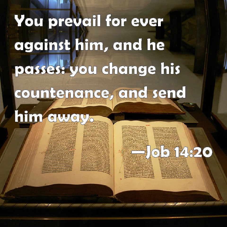Choose a Background Job 14:20 You prevail for ever against him, and he passes: you change his countenance, and send him away. KJV: Thou prevailest for ever against him, and he passeth: thou changest his countenance, and sendest him away. DRB: Thou hast strengthened him for a little while, that he may pass away for ever: thou shalt change his face, and shalt send him away. DBT: Thou prevailest for ever against him, and he passeth away; thou changest his countenance, and dismissest him. ERV: Thou prevailest for ever against him, and he passeth; thou changest his countenance, and sendest him away. WBT: Thou prevailest for ever against him, and he passeth: thou changest his countenance, and sendest him away. WEB: You forever prevail against him, and he departs. You change his face, and send him away. YLT: Thou prevailest over him for ever, and he goeth, He is changing his countenance, And Thou sendest him away.Links Job 14:20 NIV • Job 14:20 NLT • Job 14:20 ESV • Job 14:20 NASB • Job 14:20 KJV • Job 14:20 Interlinear • Job 14:20 Commentaries • Job 14:20 Parallel Texts • Job 14:20 Bible Apps • Job 14:20 Parallel • Bible Hub |
