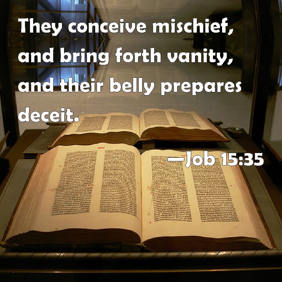 Choose a Background Job 15:35 They conceive mischief, and bring forth vanity, and their belly prepares deceit. KJV: They conceive mischief, and bring forth vanity, and their belly prepareth deceit. DRB: He hath conceived sorrow, and hath brought forth iniquity, and his womb prepareth deceits. DBT: They conceive mischief, and bring forth iniquity, and their belly prepareth deceit. ERV: They conceive mischief, and bring forth iniquity, and their belly prepareth deceit. WBT: They conceive mischief, and bring forth vanity, and their belly prepareth deceit. WEB: They conceive mischief, and bring forth iniquity. Their heart prepares deceit." YLT: To conceive misery, and to bear iniquity, Even their heart doth prepare deceit.Links Job 15:35 NIV • Job 15:35 NLT • Job 15:35 ESV • Job 15:35 NASB • Job 15:35 KJV • Job 15:35 Interlinear • Job 15:35 Commentaries • Job 15:35 Parallel Texts • Job 15:35 Bible Apps • Job 15:35 Parallel • Bible Hub |