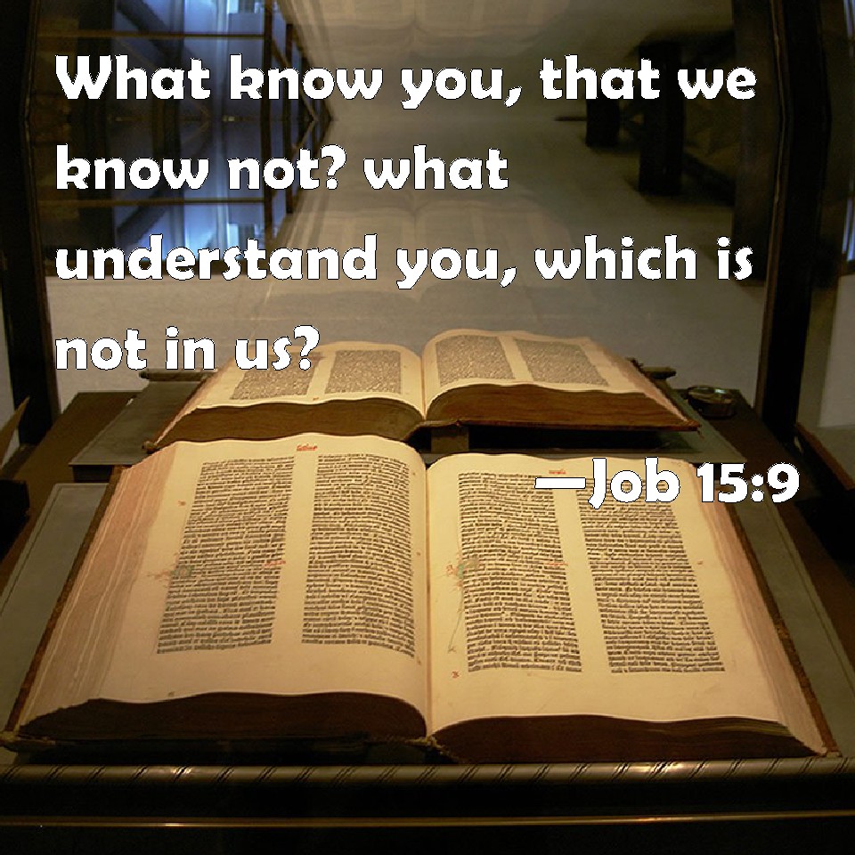Choose a Background Job 15:9 What know you, that we know not? what understand you, which is not in us? KJV: What knowest thou, that we know not? what understandest thou, which is not in us? DRB: What knowest thou that we are ignorant of? what dost thou understand that we know not? DBT: What knowest thou that we know not? what understandest thou which is not in us? ERV: What knowest thou, that we know not? what understandest thou, which is not in us? WBT: What knowest thou that we know not? what understandest thou, which is not in us? WEB: What do you know, that we don't know? What do you understand, which is not in us? YLT: What hast thou known, and we know not? Understandest thou — and it is not with us?Links Job 15:9 NIV • Job 15:9 NLT • Job 15:9 ESV • Job 15:9 NASB • Job 15:9 KJV • Job 15:9 Interlinear • Job 15:9 Commentaries • Job 15:9 Parallel Texts • Job 15:9 Bible Apps • Job 15:9 Parallel • Bible Hub |
