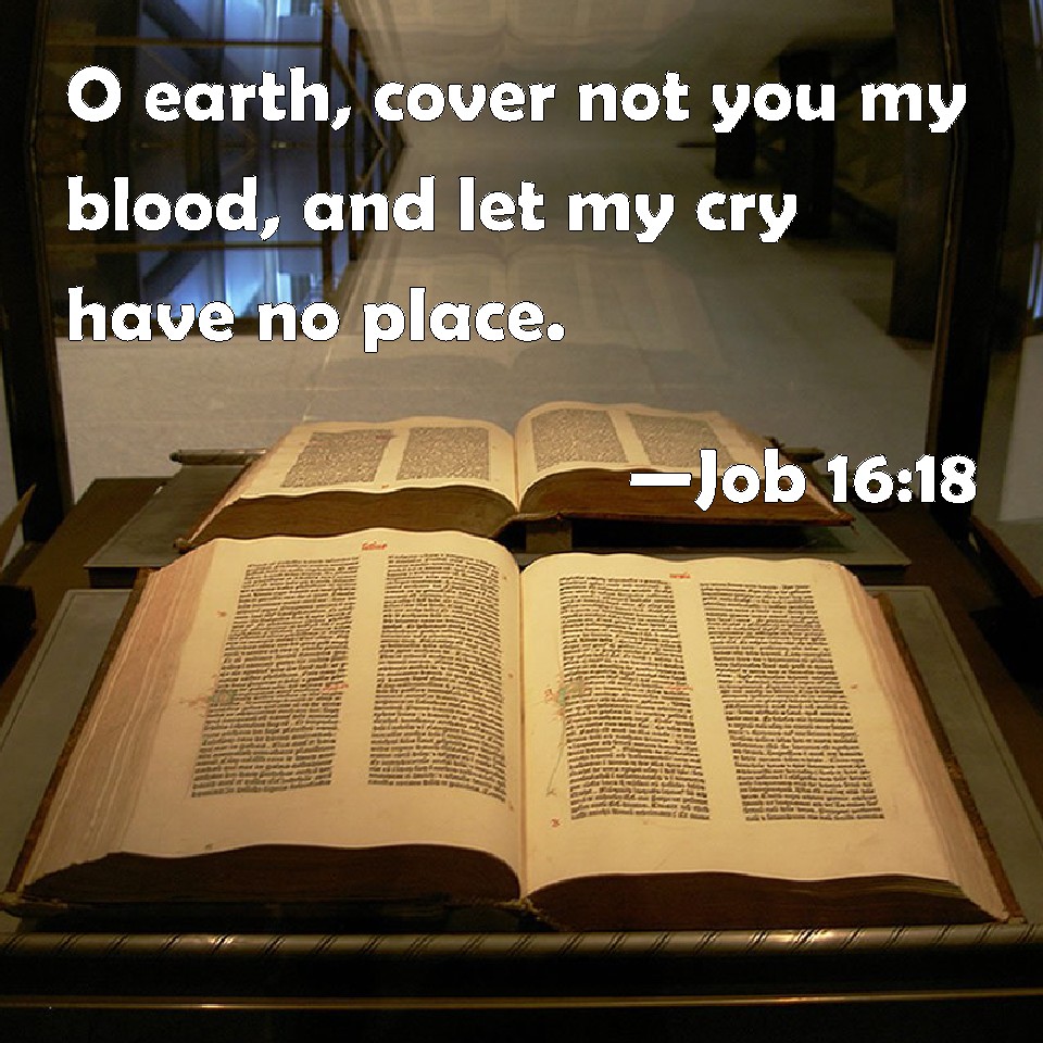 Choose a Background Job 16:18 O earth, cover not you my blood, and let my cry have no place. KJV: O earth, cover not thou my blood, and let my cry have no place. DRB: O earth, cover not thou my blood, neither let my cry find a hiding place in thee. DBT: O earth, cover not my blood, and let there be no place for my cry! ERV: O earth, cover not thou my blood, and let my cry have no resting place. WBT: O earth, cover not thou my blood, and let my cry have no place. WEB: "Earth, don't cover my blood. Let my cry have no place to rest. YLT: O earth, do not thou cover my blood! And let there not be a place for my cry.Links Job 16:18 NIV • Job 16:18 NLT • Job 16:18 ESV • Job 16:18 NASB • Job 16:18 KJV • Job 16:18 Interlinear • Job 16:18 Commentaries • Job 16:18 Parallel Texts • Job 16:18 Bible Apps • Job 16:18 Parallel • Bible Hub |