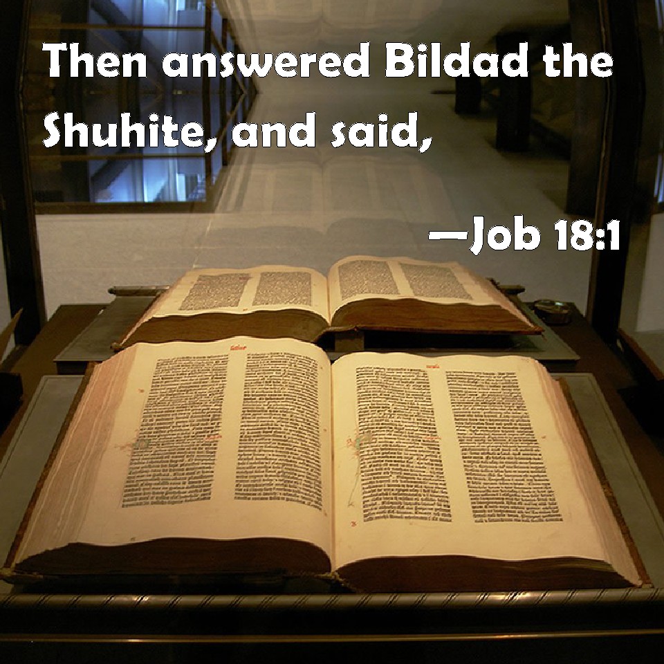 Choose a Background Job 18:1 Then answered Bildad the Shuhite, and said, KJV: Then answered Bildad the Shuhite, and said, DRB: Then Baldad the Suhite answered, and said: DBT: And Bildad the Shuhite answered and said, ERV: Then answered Bildad the Shuhite, and said, WBT: Then answered Bildad the Shuhite, and said, WEB: Then Bildad the Shuhite answered, YLT: And Bildad the Shuhite answereth and saith: — Links Job 18:1 NIV • Job 18:1 NLT • Job 18:1 ESV • Job 18:1 NASB • Job 18:1 KJV • Job 18:1 Interlinear • Job 18:1 Commentaries • Job 18:1 Parallel Texts • Job 18:1 Bible Apps • Job 18:1 Parallel • Bible Hub |