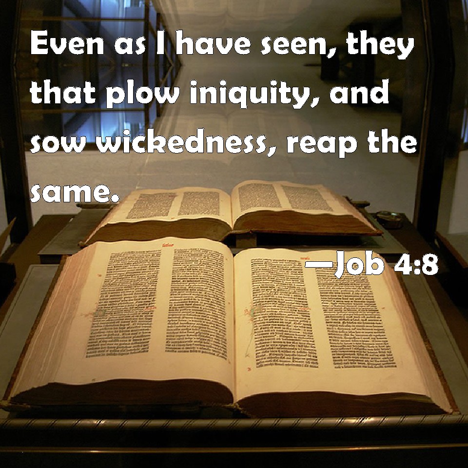 Choose a Background Job 4:8 Even as I have seen, they that plow iniquity, and sow wickedness, reap the same. KJV: Even as I have seen, they that plow iniquity, and sow wickedness, reap the same. DRB: On the contrary I have seen those who work iniquity, and sow sorrows, and reap them, DBT: Even as I have seen, they that plough iniquity and sow mischief, reap the same. ERV: According as I have seen, they that plow iniquity, and sow trouble, reap the same. WBT: Even as I have seen, they that plow iniquity, and sow wickedness, reap the same. WEB: According to what I have seen, those who plow iniquity, and sow trouble, reap the same. YLT: As I have seen — ploughers of iniquity, And sowers of misery, reap it!Links Job 4:8 NIV • Job 4:8 NLT • Job 4:8 ESV • Job 4:8 NASB • Job 4:8 KJV • Job 4:8 Interlinear • Job 4:8 Commentaries • Job 4:8 Parallel Texts • Job 4:8 Bible Apps • Job 4:8 Parallel • Bible Hub |