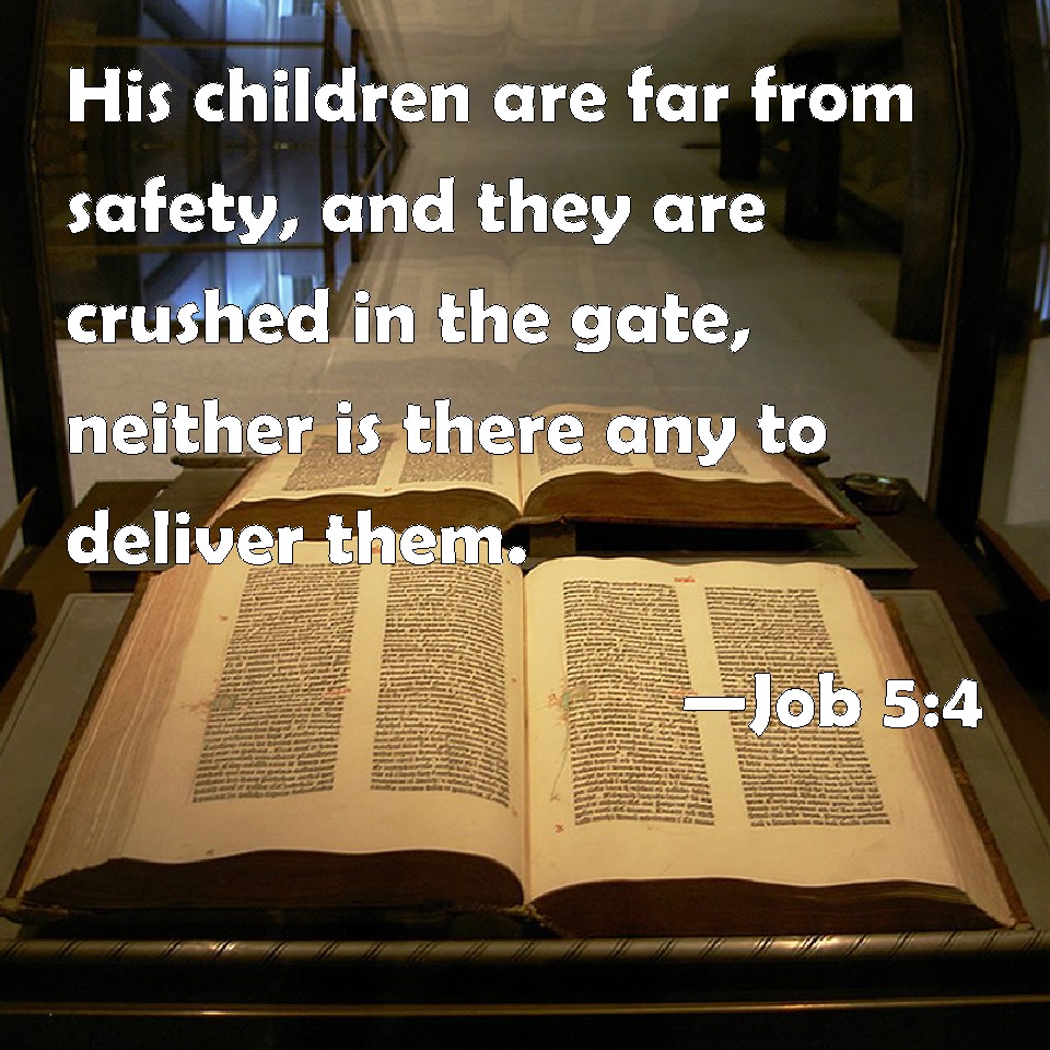 Choose a Background Job 5:4 His children are far from safety, and they are crushed in the gate, neither is there any to deliver them. KJV: His children are far from safety, and they are crushed in the gate, neither is there any to deliver them. DRB: His children shall be far from safety, and shall be destroyed in the gate, and there shall be none to deliver them. DBT: His children are far from safety, and they are crushed in the gate, and there is no deliverer: ERV: His children are far from safety, and they are crushed in the gate, neither is there any to deliver them. WBT: His children are far from safety, and they are crushed in the gate, neither is there any to deliver them. WEB: His children are far from safety. They are crushed in the gate. Neither is there any to deliver them, YLT: Far are his sons from safety, And they are bruised in the gate, And there is no deliverer.Links Job 5:4 NIV • Job 5:4 NLT • Job 5:4 ESV • Job 5:4 NASB • Job 5:4 KJV • Job 5:4 Interlinear • Job 5:4 Commentaries • Job 5:4 Parallel Texts • Job 5:4 Bible Apps • Job 5:4 Parallel • Bible Hub |