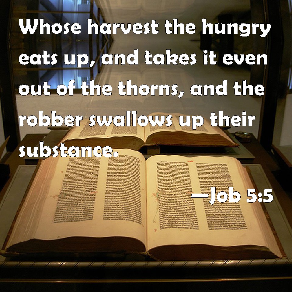 Choose a Background Job 5:5 Whose harvest the hungry eats up, and takes it even out of the thorns, and the robber swallows up their substance. KJV: Whose harvest the hungry eateth up, and taketh it even out of the thorns, and the robber swalloweth up their substance. DRB: Whose harvest the hungry shall eat, and the armed man shall take him by violence, and the thirsty shall drink up his riches. DBT: Whose harvest the hungry eateth up, and taketh even out of the thorns; and the snare gapeth for his substance. ERV: Whose harvest the hungry eateth up, and taketh it even out of the thorns, and the snare gapeth for their substance. WBT: Whose harvest the hungry eateth up, and taketh it even out of the thorns, and the robber swalloweth up their substance. WEB: whose harvest the hungry eats up, and take it even out of the thorns. The snare gapes for their substance. YLT: Whose harvest the hungry doth eat, And even from the thorns taketh it, And the designing swallowed their wealth.Links Job 5:5 NIV • Job 5:5 NLT • Job 5:5 ESV • Job 5:5 NASB • Job 5:5 KJV • Job 5:5 Interlinear • Job 5:5 Commentaries • Job 5:5 Parallel Texts • Job 5:5 Bible Apps • Job 5:5 Parallel • Bible Hub |