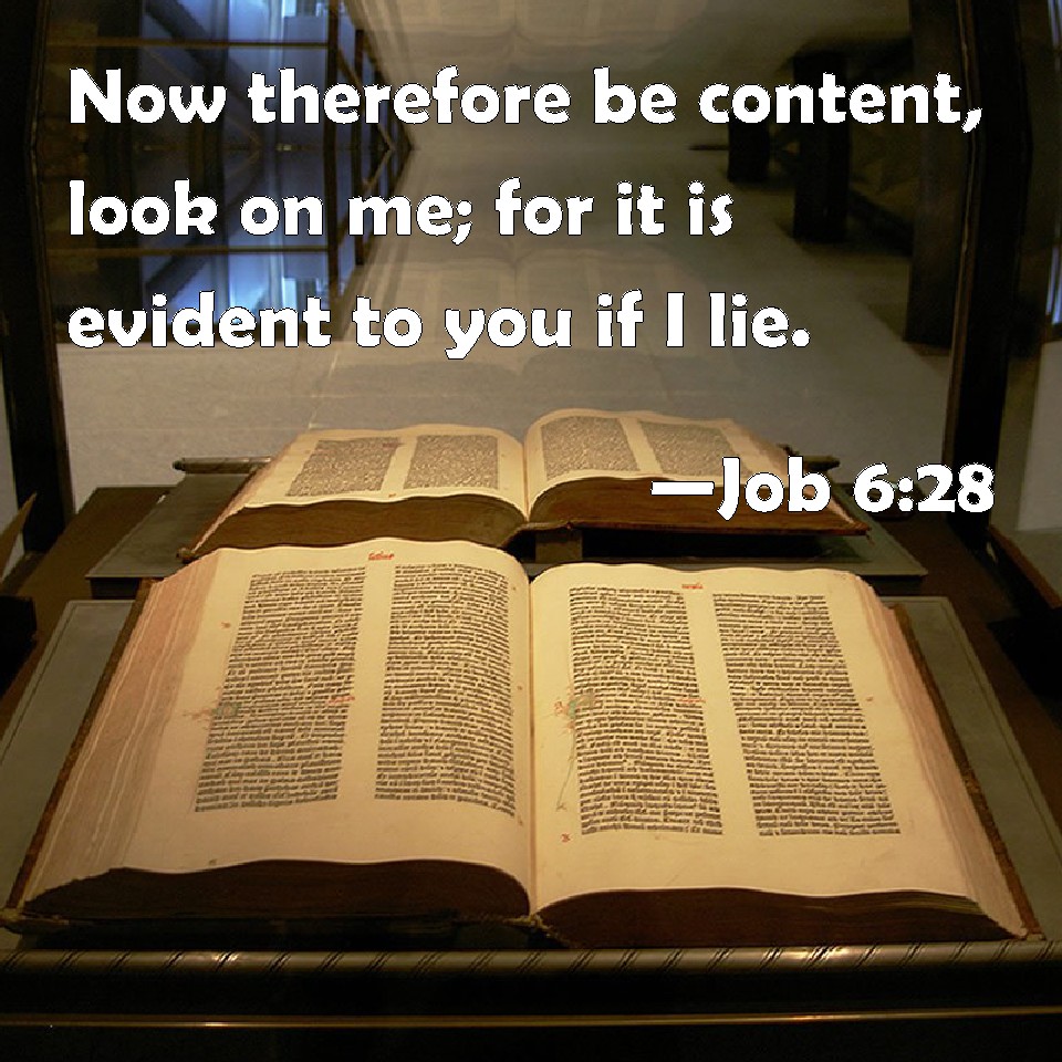 Choose a Background Job 6:28 Now therefore be content, look on me; for it is evident to you if I lie. KJV: Now therefore be content, look upon me; for it is evident unto you if I lie. DRB: However finish what you have begun, give ear, and see whether I lie. DBT: Now therefore if ye will, look upon me; and it shall be to your face if I lie. ERV: Now therefore be pleased to look upon me; for surely I shall not lie to your face. WBT: Now therefore be content, look upon me; for it is evident to you if I lie. WEB: Now therefore be pleased to look at me, for surely I shall not lie to your face. YLT: And, now, please, look upon me, Even to your face do I lie?Links Job 6:28 NIV • Job 6:28 NLT • Job 6:28 ESV • Job 6:28 NASB • Job 6:28 KJV • Job 6:28 Interlinear • Job 6:28 Commentaries • Job 6:28 Parallel Texts • Job 6:28 Bible Apps • Job 6:28 Parallel • Bible Hub |