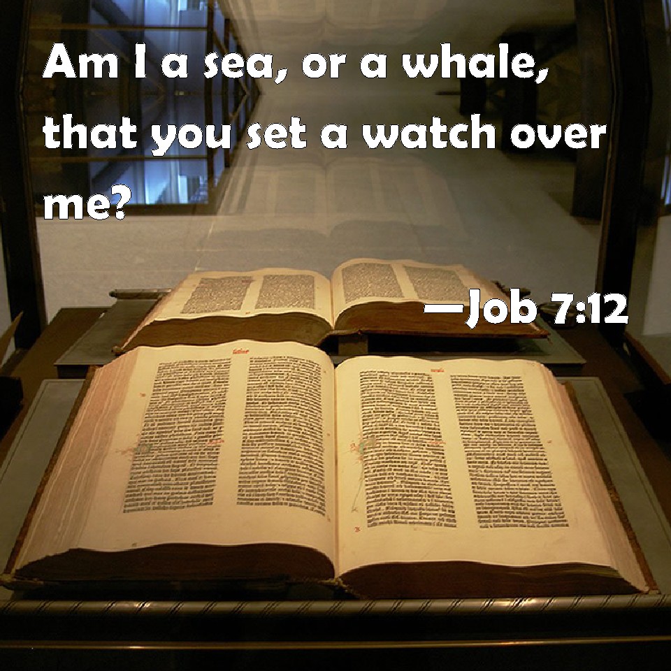 Choose a Background Job 7:12 Am I a sea, or a whale, that you set a watch over me? KJV: Am I a sea, or a whale, that thou settest a watch over me? DRB: Am I a sea, or a whale, that thou hast enclosed me in a prison? DBT: Am I a sea, or a sea-monster, that thou settest a watch over me? ERV: Am I a sea, or a sea-monster, that thou settest a watch over me? WBT: Am I a sea, or a whale, that thou settest a watch over me? WEB: Am I a sea, or a sea monster, that you put a guard over me? YLT: A sea -monster am I, or a dragon, That thou settest over me a guard?Links Job 7:12 NIV • Job 7:12 NLT • Job 7:12 ESV • Job 7:12 NASB • Job 7:12 KJV • Job 7:12 Interlinear • Job 7:12 Commentaries • Job 7:12 Parallel Texts • Job 7:12 Bible Apps • Job 7:12 Parallel • Bible Hub |