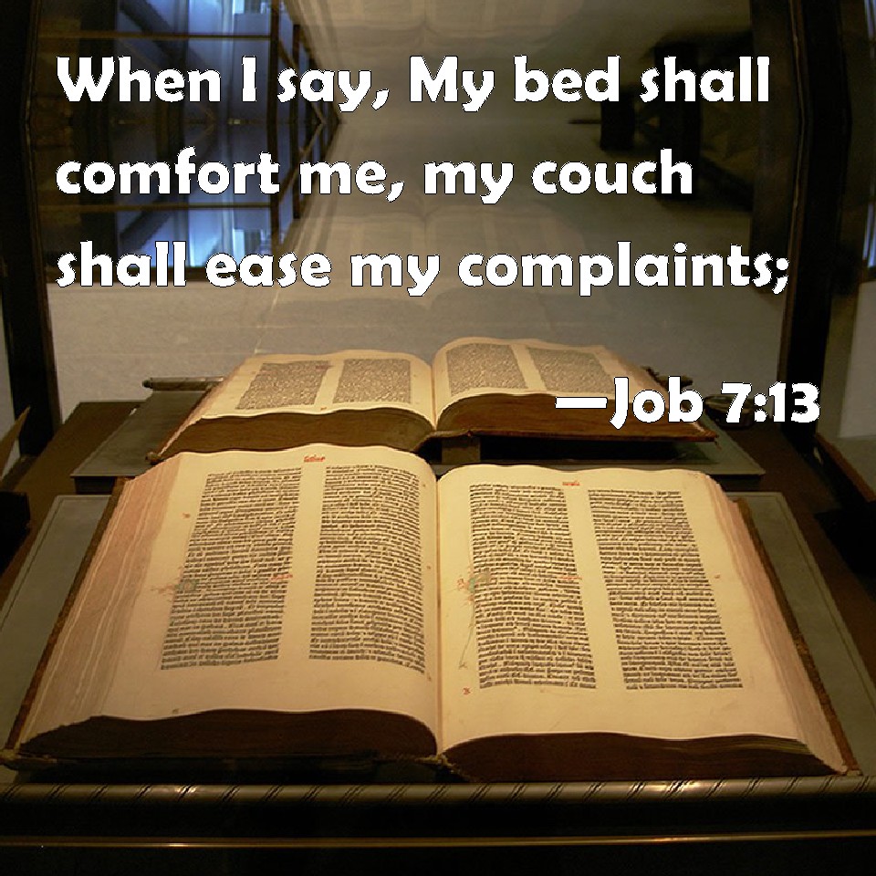 Choose a Background Job 7:13 When I say, My bed shall comfort me, my couch shall ease my complaints; KJV: When I say, My bed shall comfort me, my couch shall ease my complaint; DRB: If I say: My bed shall comfort me, and I shall be relieved speaking with myself on my couch: DBT: When I say, My bed shall comfort me, my couch shall ease my complaint; ERV: When I say, My bed shall comfort me, my couch shall ease my complaint; WBT: When I say, My bed shall comfort me, my couch shall ease my complaint; WEB: When I say, 'My bed shall comfort me. My couch shall ease my complaint;' YLT: When I said, 'My bed doth comfort me,' He taketh away in my talking my couch.Links Job 7:13 NIV • Job 7:13 NLT • Job 7:13 ESV • Job 7:13 NASB • Job 7:13 KJV • Job 7:13 Interlinear • Job 7:13 Commentaries • Job 7:13 Parallel Texts • Job 7:13 Bible Apps • Job 7:13 Parallel • Bible Hub |