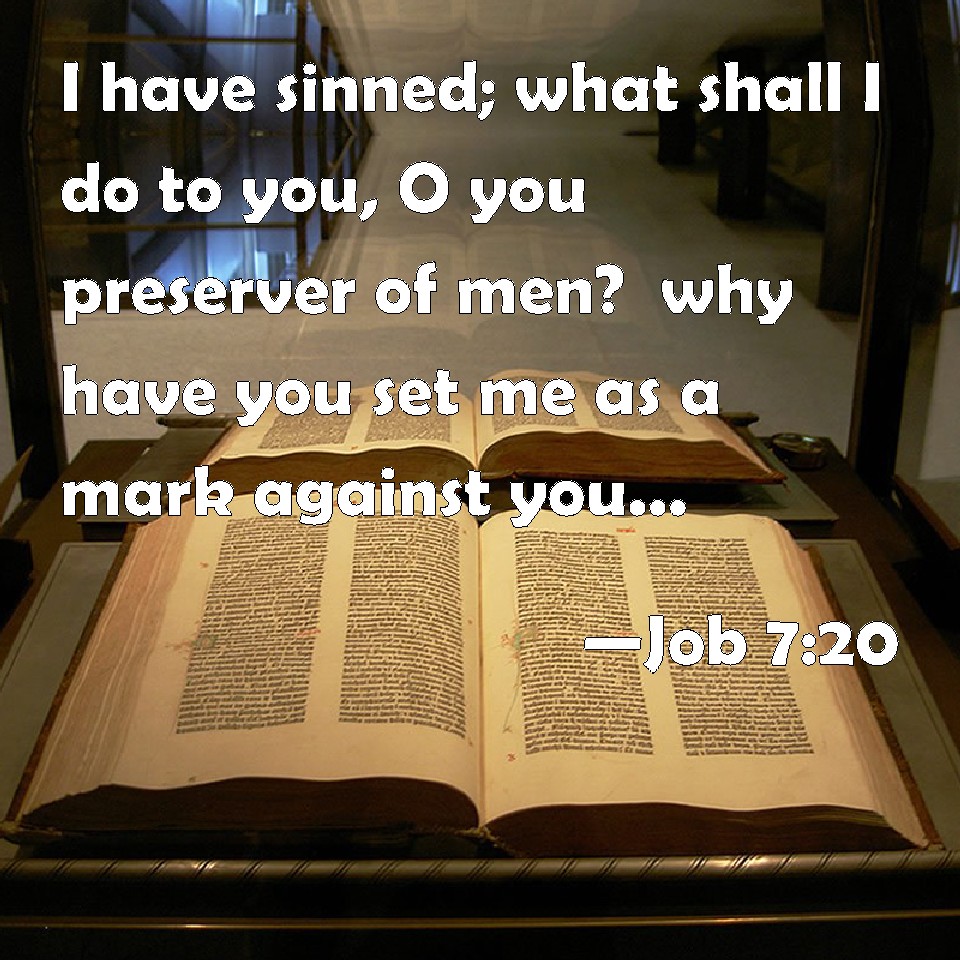 Choose a Background Job 7:20 I have sinned; what shall I do to you, O you preserver of men? why have you set me as a mark against you, so that I am a burden to myself? KJV: I have sinned; what shall I do unto thee, O thou preserver of men? why hast thou set me as a mark against thee, so that I am a burden to myself? DRB: I have sinned: what shall I do to thee, O keeper of men? why hast thou set me opposite to thee, and I am become burdensome to myself? DBT: Have I sinned, what do I unto thee, thou Observer of men? Why hast thou set me as an object of assault for thee, so that I am become a burden to myself? ERV: If I have sinned, what do I unto thee, O thou watcher of men? why hast thou set me as a mark for thee, so that I am a burden to myself? WBT: I have sinned; what shall I do to thee, O thou preserver of men? why hast thou set me as a mark against thee, so that I am a burden to myself? WEB: If I have sinned, what do I do to you, you watcher of men? Why have you set me as a mark for you, so that I am a burden to myself? YLT: I have sinned, what do I to Thee, O watcher of man? Why hast Thou set me for a mark to Thee, And I am for a burden to myself — and what?Links Job 7:20 NIV • Job 7:20 NLT • Job 7:20 ESV • Job 7:20 NASB • Job 7:20 KJV • Job 7:20 Interlinear • Job 7:20 Commentaries • Job 7:20 Parallel Texts • Job 7:20 Bible Apps • Job 7:20 Parallel • Bible Hub |