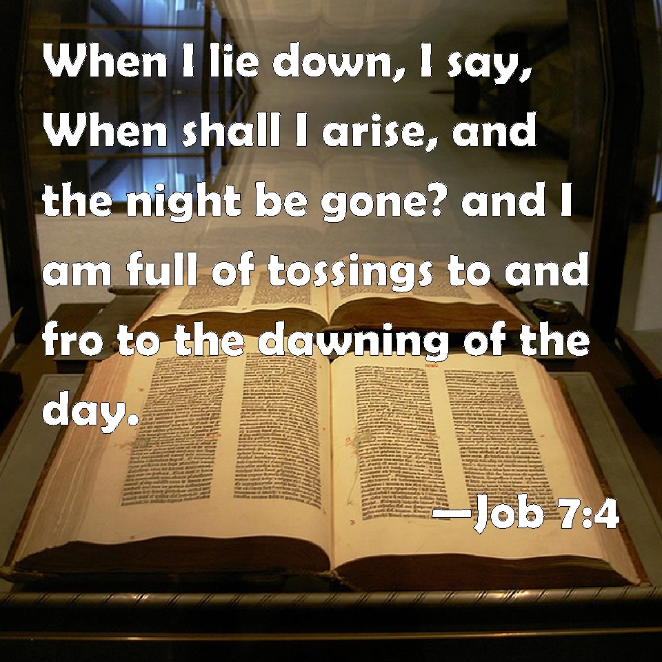 Choose a Background Job 7:4 When I lie down, I say, When shall I arise, and the night be gone? and I am full of tossings to and fro to the dawning of the day. KJV: When I lie down, I say, When shall I arise, and the night be gone? and I am full of tossings to and fro unto the dawning of the day. DRB: If I lie down to sleep, I shall say: When shall arise? and again I shall look for the evening, and shall be filled with sorrows even till darkness. DBT: If I lie down, I say, When shall I rise up, and the darkness be gone? and I am full of tossings until the dawn. ERV: When I lie down, I say, When shall I arise? but the night is long; and I am full of tossings to and fro unto the dawning of the day. WBT: When I lie down, I say, When shall I arise, and the night be gone? and I am full of tossings to and fro to the dawning of the day. WEB: When I lie down, I say, 'When shall I arise, and the night be gone?' I toss and turn until the dawning of the day. YLT: If I lay down then I said, 'When do I rise!' And evening hath been measured, And I have been full of tossings till dawn.Links Job 7:4 NIV • Job 7:4 NLT • Job 7:4 ESV • Job 7:4 NASB • Job 7:4 KJV • Job 7:4 Interlinear • Job 7:4 Commentaries • Job 7:4 Parallel Texts • Job 7:4 Bible Apps • Job 7:4 Parallel • Bible Hub |