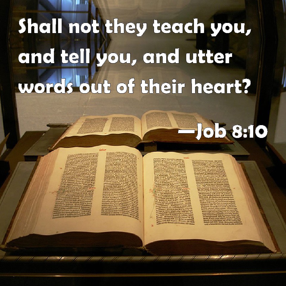 Choose a Background Job 8:10 Shall not they teach you, and tell you, and utter words out of their heart? KJV: Shall not they teach thee, and tell thee, and utter words out of their heart? DRB: And they shall teach thee: they shall speak to thee, and utter words out of their hearts. DBT: Shall not they teach thee, and tell thee, and utter words out of their heart? ERV: Shall not they teach thee, and tell thee, and utter words out of their heart? WBT: Will they not teach thee, and tell thee, and utter words out of their heart? WEB: Shall they not teach you, tell you, and utter words out of their heart? YLT: Do they not shew thee — speak to thee, And from their heart bring forth words?Links Job 8:10 NIV • Job 8:10 NLT • Job 8:10 ESV • Job 8:10 NASB • Job 8:10 KJV • Job 8:10 Interlinear • Job 8:10 Commentaries • Job 8:10 Parallel Texts • Job 8:10 Bible Apps • Job 8:10 Parallel • Bible Hub |
