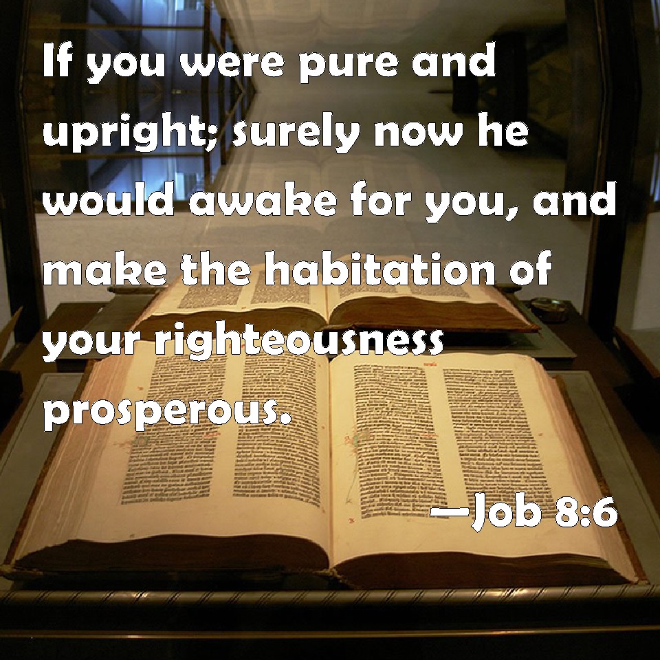 Choose a Background Job 8:6 If you were pure and upright; surely now he would awake for you, and make the habitation of your righteousness prosperous. KJV: If thou wert pure and upright; surely now he would awake for thee, and make the habitation of thy righteousness prosperous. DRB: If thou wilt walk clean and upright, he will presently awake onto thee, and will make the dwelling of thy justice peaceable: DBT: If thou be pure and upright, surely now he will awake for thee, and make the habitation of thy righteousness prosperous; ERV: If thou wert pure and upright; surely now he would awake for thee, and make the habitation of thy righteousness prosperous. WBT: If thou wert pure and upright; surely now he would awake for thee, and make the habitation of thy righteousness prosperous. WEB: If you were pure and upright, surely now he would awaken for you, and make the habitation of your righteousness prosperous. YLT: If pure and upright thou art, Surely now He waketh for thee, And hath completed The habitation of thy righteousness.Links Job 8:6 NIV • Job 8:6 NLT • Job 8:6 ESV • Job 8:6 NASB • Job 8:6 KJV • Job 8:6 Interlinear • Job 8:6 Commentaries • Job 8:6 Parallel Texts • Job 8:6 Bible Apps • Job 8:6 Parallel • Bible Hub |