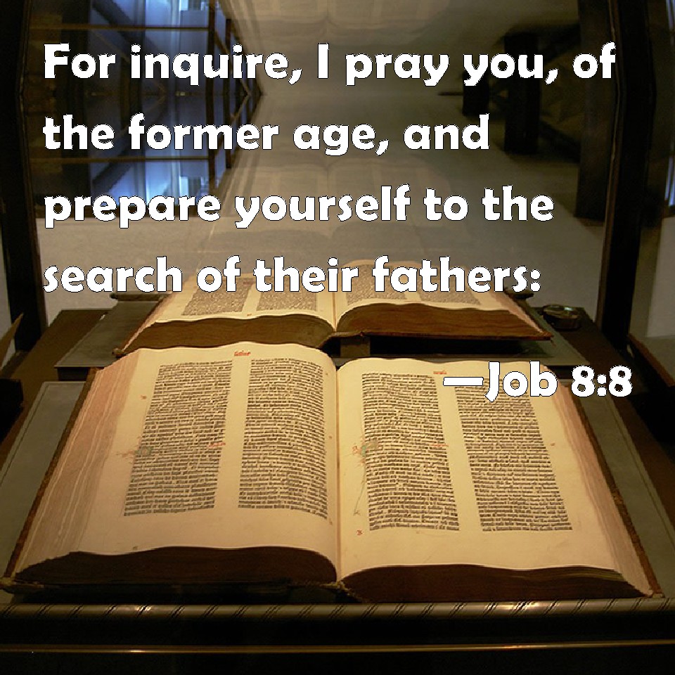 Choose a Background Job 8:8 For inquire, I pray you, of the former age, and prepare yourself to the search of their fathers: KJV: For inquire, I pray thee, of the former age, and prepare thyself to the search of their fathers: DRB: For inquire of the former generation, and search diligently into the memory of the fathers: DBT: For inquire, I pray thee, of the former generation, and attend to the researches of their fathers; ERV: For inquire, I pray thee, of the former age, and apply thyself to that which their fathers have searched out: WBT: For inquire, I pray thee, of the former age, and prepare thyself to the search of their fathers: WEB: "Please inquire of past generations. Find out about the learning of their fathers. YLT: For, ask I pray thee of a former generation, And prepare to a search of their fathers,Links Job 8:8 NIV • Job 8:8 NLT • Job 8:8 ESV • Job 8:8 NASB • Job 8:8 KJV • Job 8:8 Interlinear • Job 8:8 Commentaries • Job 8:8 Parallel Texts • Job 8:8 Bible Apps • Job 8:8 Parallel • Bible Hub |
