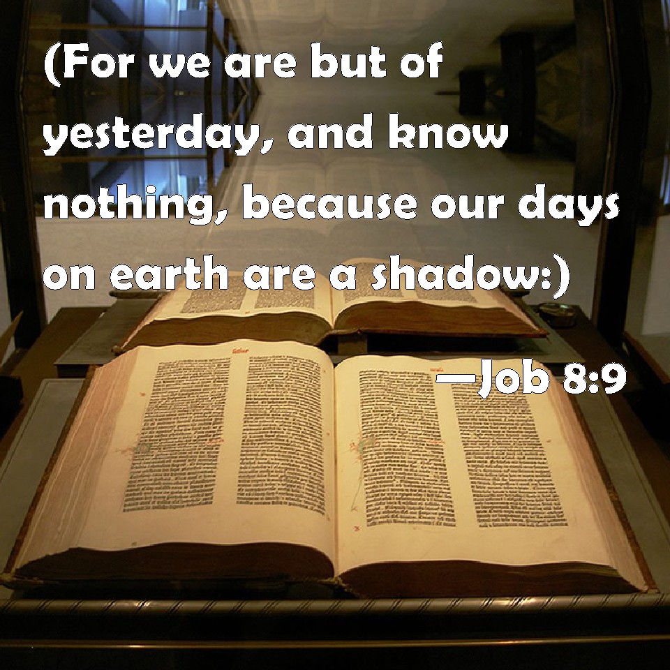 Choose a Background Job 8:9 (For we are but of yesterday, and know nothing, because our days on earth are a shadow:) KJV: (For we are but of yesterday, and know nothing, because our days upon earth are a shadow:) DRB: (For we are but of yesterday, and are ignorant that our days upon earth are but a shadow:) DBT: For we are but of yesterday, and know nothing, for our days upon earth are a shadow. ERV: (For we are but of yesterday, and know nothing, because our days upon earth are a shadow:) WBT: (For we are but of yesterday, and know nothing, because our days upon earth are a shadow:) WEB: (For we are but of yesterday, and know nothing, because our days on earth are a shadow.) YLT: (For of yesterday we are, and we know not, For a shadow are our days on earth.)Links Job 8:9 NIV • Job 8:9 NLT • Job 8:9 ESV • Job 8:9 NASB • Job 8:9 KJV • Job 8:9 Interlinear • Job 8:9 Commentaries • Job 8:9 Parallel Texts • Job 8:9 Bible Apps • Job 8:9 Parallel • Bible Hub |
