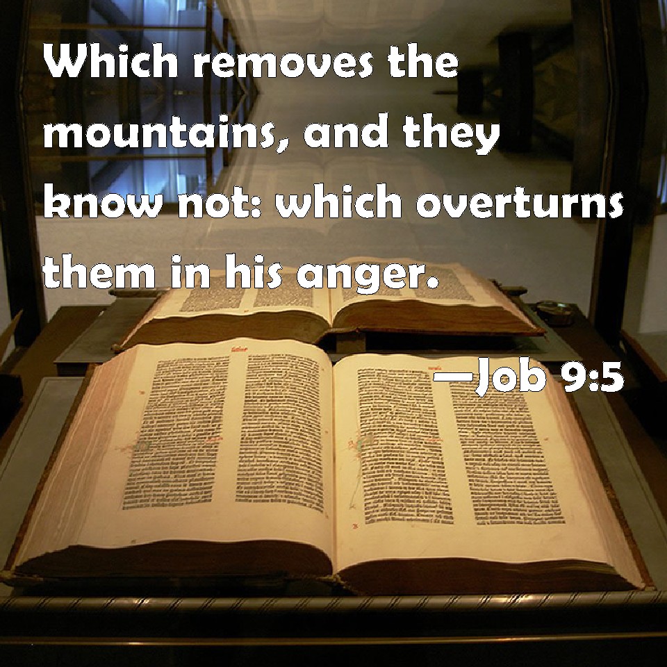 Choose a Background Job 9:5 Which removes the mountains, and they know not: which overturns them in his anger. KJV: Which removeth the mountains, and they know not: which overturneth them in his anger. DRB: Who hath removed mountains, and they whom he overthrew in his wrath, knew it not. DBT: Who removeth mountains, and they know it not, when he overturneth them in his anger; ERV: Which removeth the mountains, and they know it not, when he overturneth them in his anger. WBT: Who removeth the mountains, and they know not: who overturneth them in his anger. WEB: He removes the mountains, and they don't know it, when he overturns them in his anger. YLT: Who is removing mountains, And they have not known, Who hath overturned them in His anger.Links Job 9:5 NIV • Job 9:5 NLT • Job 9:5 ESV • Job 9:5 NASB • Job 9:5 KJV • Job 9:5 Interlinear • Job 9:5 Commentaries • Job 9:5 Parallel Texts • Job 9:5 Bible Apps • Job 9:5 Parallel • Bible Hub |