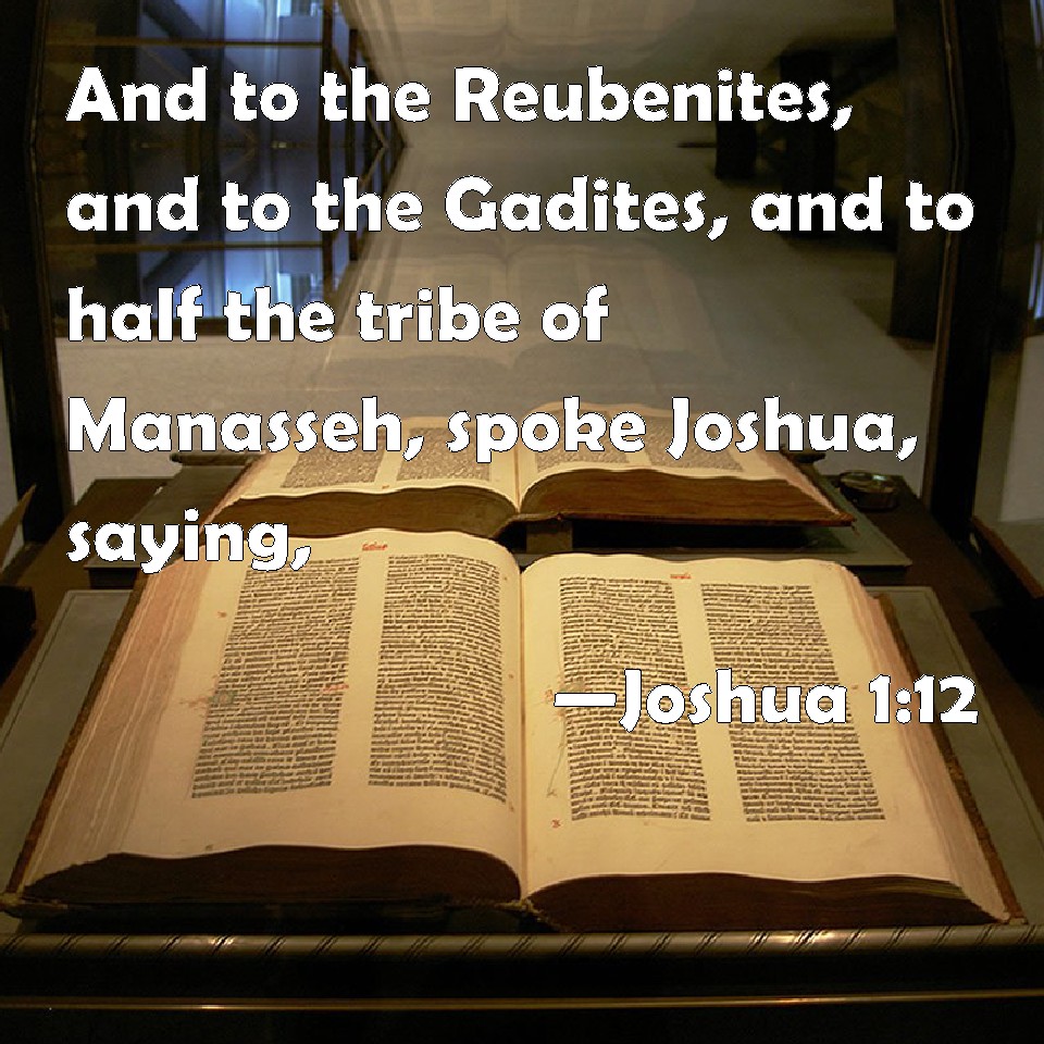 Choose a Background Joshua 1:12 And to the Reubenites, and to the Gadites, and to half the tribe of Manasseh, spoke Joshua, saying, KJV: And to the Reubenites, and to the Gadites, and to half the tribe of Manasseh, spake Joshua, saying, DRB: And he said to the Rubenites, and the Gadites, and the half tribe of Manasses: DBT: And to the Reubenites and to the Gadites and to half the tribe of Manasseh spoke Joshua, saying, ERV: And to the Reubenites, and to the Gadites, and to the half tribe of Manasseh, spake Joshua, saying, WBT: And to the Reubenites, and to the Gadites, and to half the tribe of Manasseh, spoke Joshua, saying, WEB: Joshua spoke to the Reubenites, and to the Gadites, and to the half-tribe of Manasseh, saying, YLT: And to the Reubenite, and to the Gadite, and to the half of the tribe of Manasseh, hath Joshua spoken, saying,Links Joshua 1:12 NIV • Joshua 1:12 NLT • Joshua 1:12 ESV • Joshua 1:12 NASB • Joshua 1:12 KJV • Joshua 1:12 Interlinear • Joshua 1:12 Commentaries • Joshua 1:12 Parallel Texts • Joshua 1:12 Bible Apps • Joshua 1:12 Parallel • Bible Hub |