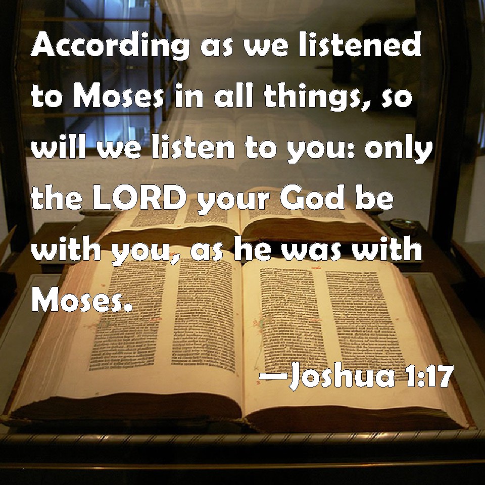 Choose a Background Joshua 1:17 According as we listened to Moses in all things, so will we listen to you: only the LORD your God be with you, as he was with Moses. KJV: According as we hearkened unto Moses in all things, so will we hearken unto thee: only the LORD thy God be with thee, as he was with Moses. DRB: As we obeyed Moses in all things, so will we obey thee also: only be the Lord thy God with thee, as he was with Moses. DBT: According as we hearkened to Moses in all things, so will we hearken to thee; only may Jehovah thy God be with thee as he was with Moses. ERV: According as we hearkened unto Moses in all things, so will we hearken unto thee: only the LORD thy God be with thee, as he was with Moses. WBT: According as we hearkened to Moses in all things, so will we hearken to thee: only the LORD thy God be with thee, as he was with Moses. WEB: Just as we listened to Moses in all things, so will we listen to you. Only may Yahweh your God be with you, as he was with Moses. YLT: according to all that we hearkened unto Moses in, so we hearken unto thee; surely Jehovah thy God is with thee as He hath been with Moses.Links Joshua 1:17 NIV • Joshua 1:17 NLT • Joshua 1:17 ESV • Joshua 1:17 NASB • Joshua 1:17 KJV • Joshua 1:17 Interlinear • Joshua 1:17 Commentaries • Joshua 1:17 Parallel Texts • Joshua 1:17 Bible Apps • Joshua 1:17 Parallel • Bible Hub |