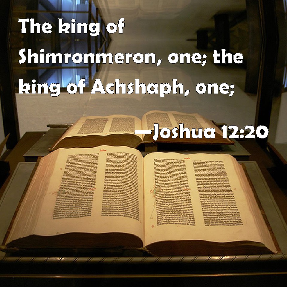 Choose a Background Joshua 12:20 The king of Shimronmeron, one; the king of Achshaph, one; KJV: The king of Shimronmeron, one; the king of Achshaph, one; DRB: The king of Semeron one, the king of Achsaph one, DBT: the king of Shimron-meron, one; the king of Achshaph, one; ERV: the king of Shimron-meron, one; the king of Achshaph, one; WBT: The king of Shimron-meron, one; the king of Achshaph, one; WEB: the king of Shimron Meron, one; the king of Achshaph, one; YLT: The king of Shimron-Meron, one; The king of Achshaph, one;Links Joshua 12:20 NIV • Joshua 12:20 NLT • Joshua 12:20 ESV • Joshua 12:20 NASB • Joshua 12:20 KJV • Joshua 12:20 Interlinear • Joshua 12:20 Commentaries • Joshua 12:20 Parallel Texts • Joshua 12:20 Bible Apps • Joshua 12:20 Parallel • Bible Hub |