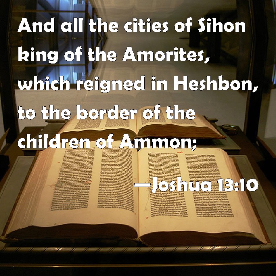 Choose a Background Joshua 13:10 And all the cities of Sihon king of the Amorites, which reigned in Heshbon, to the border of the children of Ammon; KJV: And all the cities of Sihon king of the Amorites, which reigned in Heshbon, unto the border of the children of Ammon; DRB: And all the cities of Sehon, king of the Amorrhites, who reigned in Hesebon, unto the borders of the children of Ammon. DBT: and all the cities of Sihon the king of the Amorites, who reigned at Heshbon, to the border of the children of Ammon; ERV: and all the cities of Sihon king of the Amorites, which reigned in Heshbon, unto the border of the children of Ammon; WBT: And all the cities of Sihon king of the Amorites, who reigned in Heshbon, to the border of the children of Ammon; WEB: and all the cities of Sihon king of the Amorites, who reigned in Heshbon, to the border of the children of Ammon; YLT: and all the cities of Sihon king of the Amorite, who reigned in Heshbon, unto the border of the Bene-Ammon,Links Joshua 13:10 NIV • Joshua 13:10 NLT • Joshua 13:10 ESV • Joshua 13:10 NASB • Joshua 13:10 KJV • Joshua 13:10 Interlinear • Joshua 13:10 Commentaries • Joshua 13:10 Parallel Texts • Joshua 13:10 Bible Apps • Joshua 13:10 Parallel • Bible Hub |