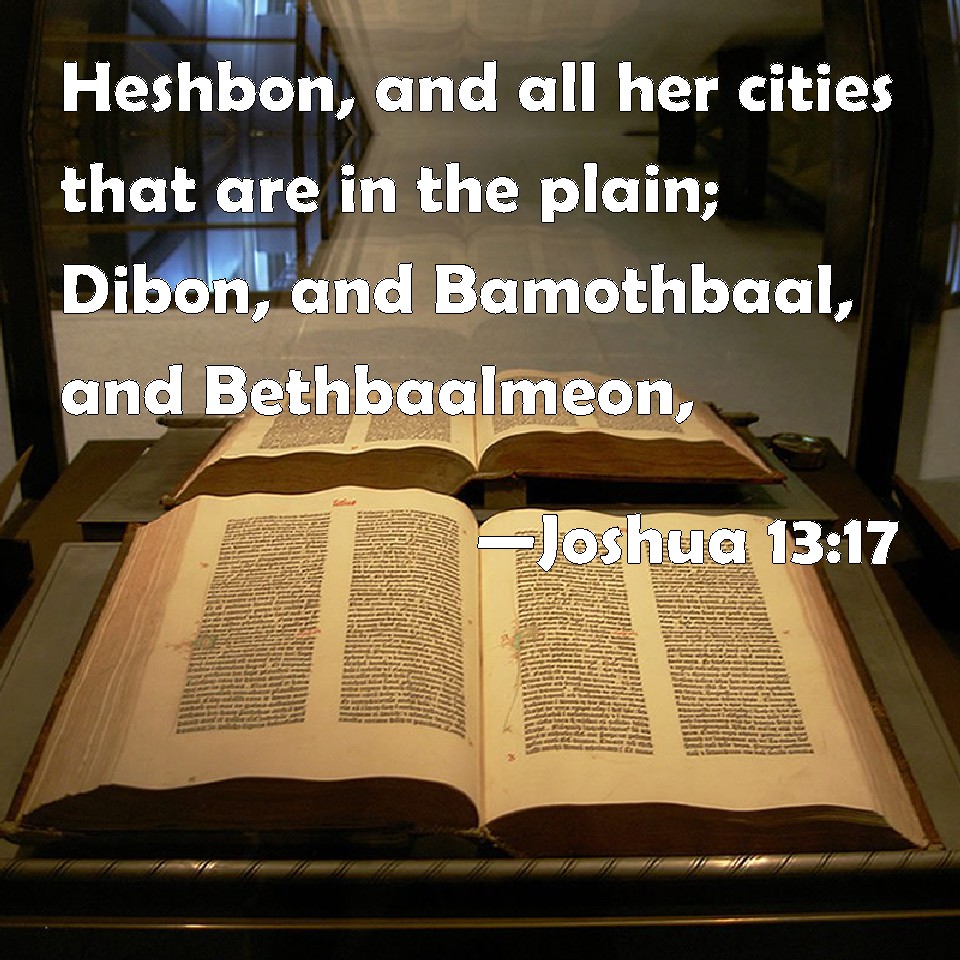 Choose a Background Joshua 13:17 Heshbon, and all her cities that are in the plain; Dibon, and Bamothbaal, and Bethbaalmeon, KJV: Heshbon, and all her cities that are in the plain; Dibon, and Bamothbaal, and Bethbaalmeon, DRB: And Hesebon, and all their villages, which are in the plains. Dibon also, and Bamothbaal, and the town of Baalmaon, DBT: Heshbon, and all her cities that are in the plateau, Dibon, and Bamoth-Baal, and Beth-Baal-meon, ERV: Heshbon, and all her cities that are in the plain; Dibon, and Bamoth-baal, and Beth-baal-meon; WBT: Heshbon, and all her cities that are in the plain; Dibon, and Bamoth-baal, and Beth-baal-meon, WEB: Heshbon, and all its cities that are in the plain; Dibon, Bamoth Baal, Beth Baal Meon, YLT: Heshbon, and all its cities which are in the plain, Dibon, and Bamoth-Baal, and Beth-Baal-Meon,Links Joshua 13:17 NIV • Joshua 13:17 NLT • Joshua 13:17 ESV • Joshua 13:17 NASB • Joshua 13:17 KJV • Joshua 13:17 Interlinear • Joshua 13:17 Commentaries • Joshua 13:17 Parallel Texts • Joshua 13:17 Bible Apps • Joshua 13:17 Parallel • Bible Hub |
