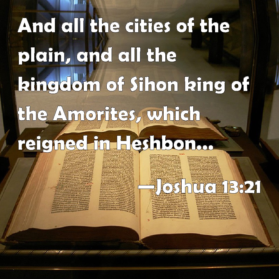 Choose a Background Joshua 13:21 And all the cities of the plain, and all the kingdom of Sihon king of the Amorites, which reigned in Heshbon, whom Moses smote with the princes of Midian, Evi, and Rekem, and Zur, and Hur, and Reba, which were dukes of Sihon, dwelling in the country. KJV: And all the cities of the plain, and all the kingdom of Sihon king of the Amorites, which reigned in Heshbon, whom Moses smote with the princes of Midian, Evi, and Rekem, and Zur, and Hur, and Reba, which were dukes of Sihon, dwelling in the country. DRB: And all the cities of the plain, and all the kingdoms of Sehon king of the Amorrhites, that reigned in Hesebon, whom Moses slew with the princes of Madian: Hevi, and Recem, and Sur and Hur, and Rebe, dukes of Sehon inhabitants of the land. DBT: all the cities of the plateau, and the whole kingdom of Sihon the king of the Amorites, who reigned at Heshbon, whom Moses smote, him and the princes of Midian, Evi, and Rekem, and Zur, and Hur, and Reba, the chiefs of Sihon dwelling in the land. ERV: and all the cities of the plain, and all the kingdom of Sihon king of the Amorites, which reigned in Heshbon, whom Moses smote with the chiefs of Midian, Evi, and Rekem, and Zur, and Hur, and Reba, the princes of Sihon, that dwelt in the land. WBT: And all the cities of the plain, and all the kingdom of Sihon king of the Amorites, who reigned in Heshbon, whom Moses smote with the princes of Midian, Evi, and Rekem, and Zur, and Hur, and Reba, dukes of Sihon, dwelling in the country. WEB: all the cities of the plain, and all the kingdom of Sihon king of the Amorites, who reigned in Heshbon, whom Moses struck with the chiefs of Midian, Evi, Rekem, Zur, Hur, and Reba, the princes of Sihon, who lived in the land. YLT: and all the cities of the plain, and all the kingdom of Sihon king of the Amorite, who reigned in Heshbon, whom Moses smote, with the princes of Midian, Evi, and Rekem, and Zur, and Hur, and Reba, princes of Sihon, inhabitants of the land.Links Joshua 13:21 NIV • Joshua 13:21 NLT • Joshua 13:21 ESV • Joshua 13:21 NASB • Joshua 13:21 KJV • Joshua 13:21 Interlinear • Joshua 13:21 Commentaries • Joshua 13:21 Parallel Texts • Joshua 13:21 Bible Apps • Joshua 13:21 Parallel • Bible Hub |