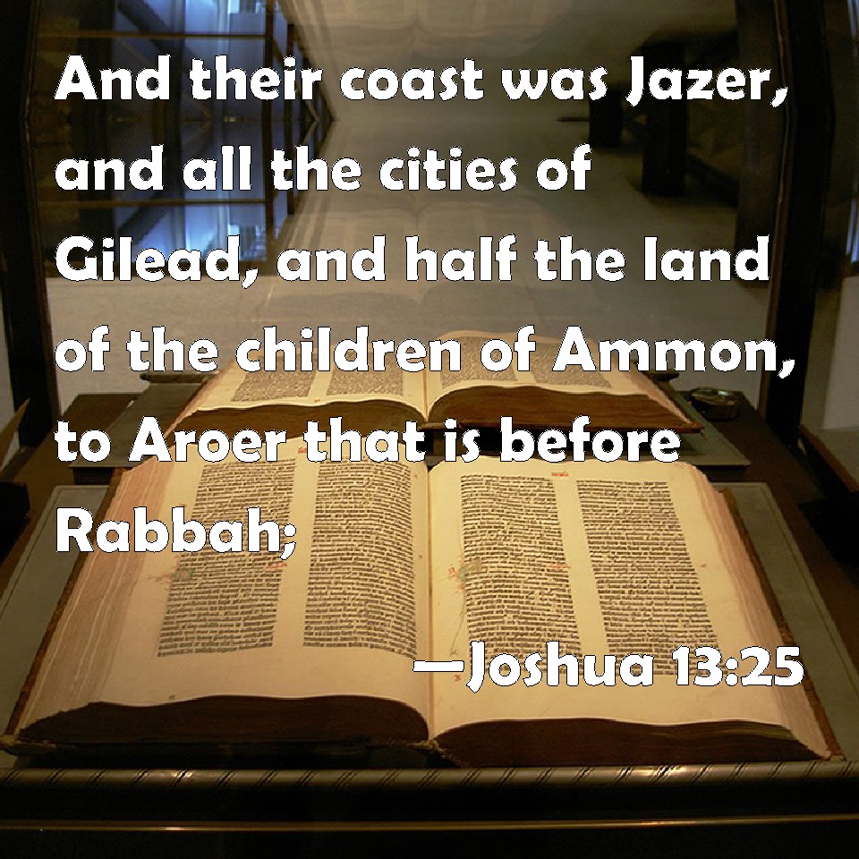 Choose a Background Joshua 13:25 And their coast was Jazer, and all the cities of Gilead, and half the land of the children of Ammon, to Aroer that is before Rabbah; KJV: And their coast was Jazer, and all the cities of Gilead, and half the land of the children of Ammon, unto Aroer that is before Rabbah; DRB: The border of Jaser, and all the cities of Galaad, and half the land of the children of Ammon: as far as Aroer which is over against Rabba: DBT: And their territory was Jaazer, and all the cities of Gilead, and half the land of the children of Ammon, to Aroer which is before Rabbah; ERV: And their border was Jazer, and all the cities of Gilead, and half the land of the children of Ammon, unto Aroer that is before Rabbah; WBT: And their border was Jazer, and all the cities of Gilead, and half the land of the children of Ammon, to Aroer that is before Rabbah; WEB: Their border was Jazer, and all the cities of Gilead, and half the land of the children of Ammon, to Aroer that is before Rabbah; YLT: and the border is to them Jazer, and all the cities of Gilead, and the half of the land of the Bene-Ammon, unto Aroer which is on the front of Rabbah,Links Joshua 13:25 NIV • Joshua 13:25 NLT • Joshua 13:25 ESV • Joshua 13:25 NASB • Joshua 13:25 KJV • Joshua 13:25 Interlinear • Joshua 13:25 Commentaries • Joshua 13:25 Parallel Texts • Joshua 13:25 Bible Apps • Joshua 13:25 Parallel • Bible Hub |