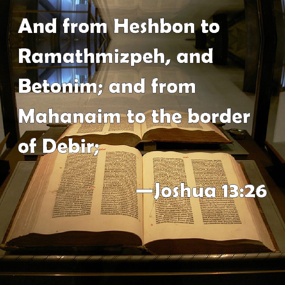 Choose a Background Joshua 13:26 And from Heshbon to Ramathmizpeh, and Betonim; and from Mahanaim to the border of Debir; KJV: And from Heshbon unto Ramathmizpeh, and Betonim; and from Mahanaim unto the border of Debir; DRB: And from Hesebon unto Ramoth, Masphe and Betonim: and from Manaim unto the borders of Dabir. DBT: and from Heshbon to Ramath-Mizpeh, and Betonim; and from Mahanaim to the border of Debir; ERV: and from Heshbon unto Ramath-mizpeh, and Betonim; and from Mahanaim unto the border of Debir; WBT: And from Heshbon to Ramath-mizpeh, and Betonim; and from Mahanaim to the border of Debir; WEB: and from Heshbon to Ramath Mizpeh, and Betonim; and from Mahanaim to the border of Debir; YLT: and from Heshbon unto Ramath-Mispeh, and Betonim, and from Mahanaim unto the border of Debir,Links Joshua 13:26 NIV • Joshua 13:26 NLT • Joshua 13:26 ESV • Joshua 13:26 NASB • Joshua 13:26 KJV • Joshua 13:26 Interlinear • Joshua 13:26 Commentaries • Joshua 13:26 Parallel Texts • Joshua 13:26 Bible Apps • Joshua 13:26 Parallel • Bible Hub |