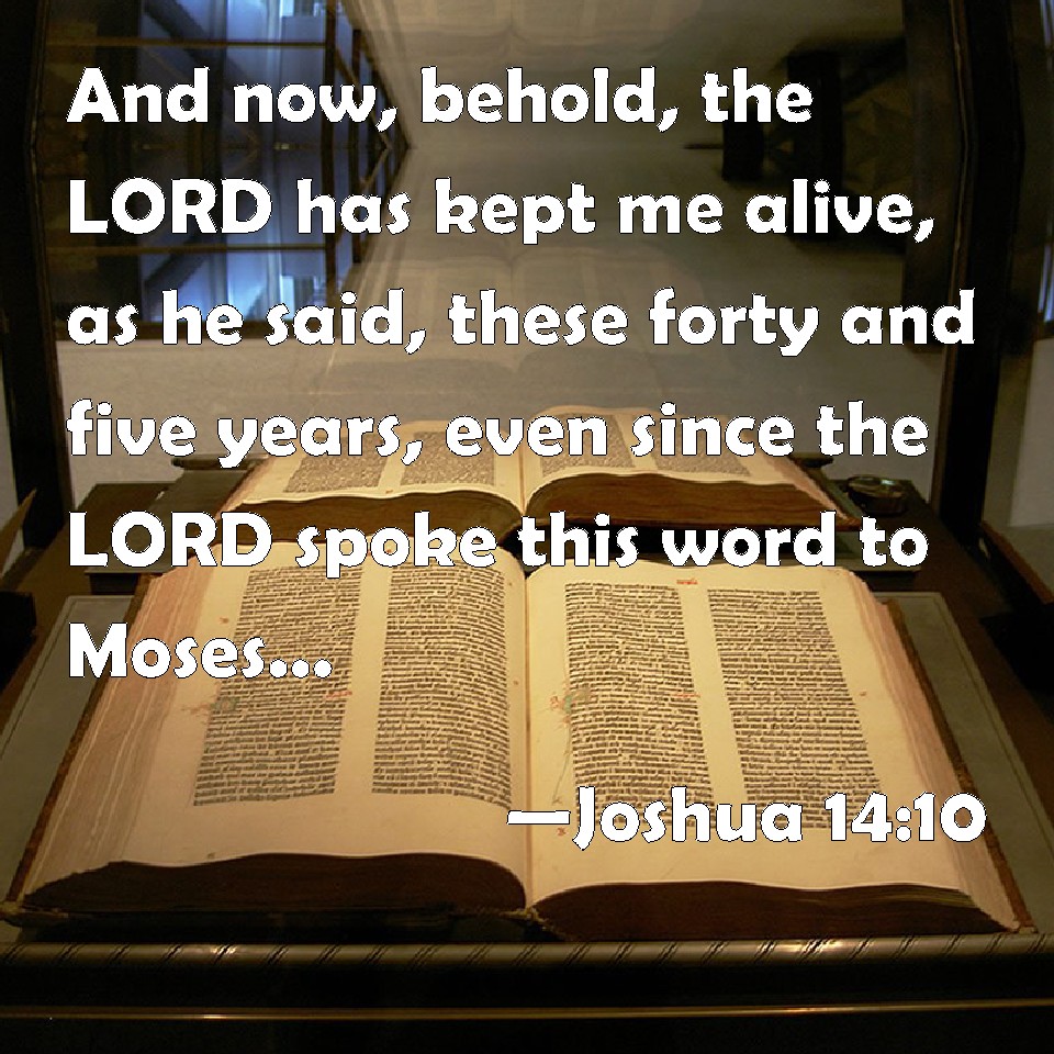 Choose a Background Joshua 14:10 And now, behold, the LORD has kept me alive, as he said, these forty and five years, even since the LORD spoke this word to Moses, while the children of Israel wandered in the wilderness: and now, see, I am this day fourscore and five years old. KJV: And now, behold, the LORD hath kept me alive, as he said, these forty and five years, even since the LORD spake this word unto Moses, while the children of Israel wandered in the wilderness: and now, lo, I am this day fourscore and five years old. DRB: The Lord therefore hath granted me life, as he promised until this present day. It is forty and five years since the Lord spoke this word to Moses, when Israel journeyed through the wilderness: this day I am eighty-five years old, DBT: And now behold, Jehovah has kept me alive, as he said, these forty-five years, since Jehovah spoke this word to Moses, when Israel wandered in the wilderness; and now behold, I am this day eighty-five years old. ERV: And now, behold, the LORD hath kept me alive, as he spake, these forty and five years, from the time that the LORD spake this word unto Moses, while Israel walked in the wilderness: and now, lo, I am this day fourscore and five years old. WBT: And now, behold, the LORD hath kept me alive, as he said, these forty and five years, even since the LORD spoke this word to Moses, while the children of Israel wandered in the wilderness: and now, lo, I am this day eighty five years old. WEB: "Now, behold, Yahweh has kept me alive, as he spoke, these forty-five years, from the time that Yahweh spoke this word to Moses, while Israel walked in the wilderness. Now, behold, I am eighty-five years old, today. YLT: And, now, lo, Jehovah hath kept me alive, as He hath spoken, these forty and five years, since Jehovah spake this word unto Moses, when Israel went in the wilderness; and now, lo, I am to-day a son of five and eighty years;Links Joshua 14:10 NIV • Joshua 14:10 NLT • Joshua 14:10 ESV • Joshua 14:10 NASB • Joshua 14:10 KJV • Joshua 14:10 Interlinear • Joshua 14:10 Commentaries • Joshua 14:10 Parallel Texts • Joshua 14:10 Bible Apps • Joshua 14:10 Parallel • Bible Hub |