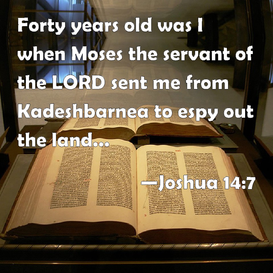 Joshua 14:7 Forty years old was I when Moses the servant of the LORD sent me from Kadeshbarnea to espy out the land; and I brought him word again as it was in my heart.