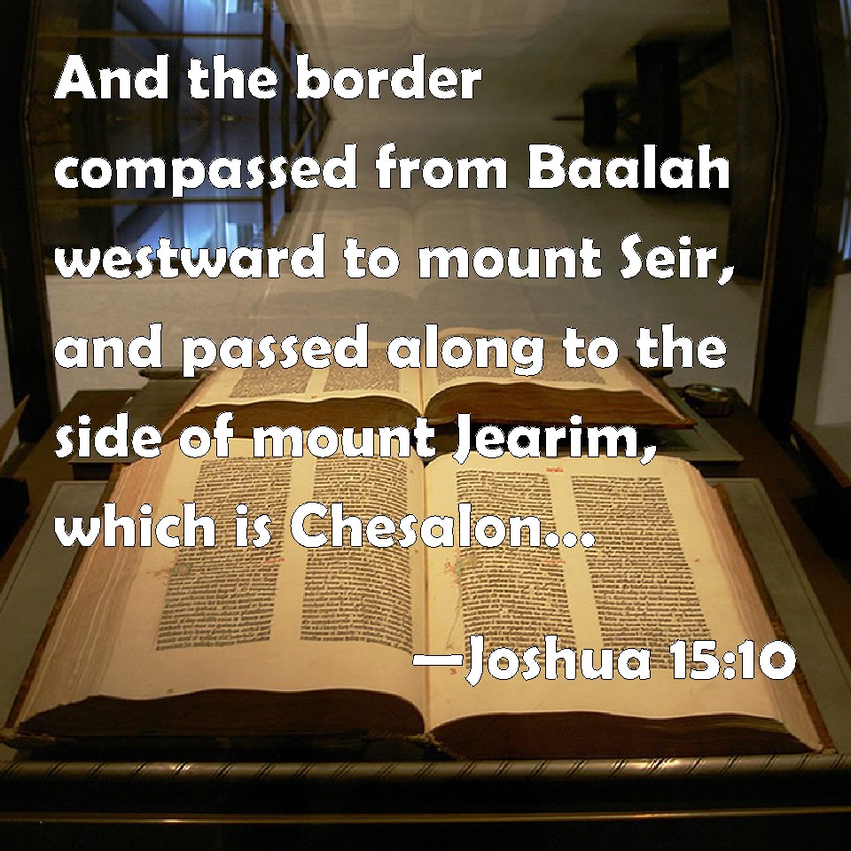 Choose a Background Joshua 15:10 And the border compassed from Baalah westward to mount Seir, and passed along to the side of mount Jearim, which is Chesalon, on the north side, and went down to Bethshemesh, and passed on to Timnah: KJV: And the border compassed from Baalah westward unto mount Seir, and passed along unto the side of mount Jearim, which is Chesalon, on the north side, and went down to Bethshemesh, and passed on to Timnah: DRB: And it compasseth from Baala westward unto mount Seir: and passeth by the side of mount Jarim to the north into Cheslon: and goeth down into Bethsames, and passeth into Thamna. DBT: and the border turned from Baalah westwards toward mount Seir, and passed toward the side of Har-jearim, that is, Chesalon, northwards, and went down to Beth-shemesh, and passed Timnah. ERV: and the border turned about from Baalah westward unto mount Seir, and passed along unto the side of mount Jearim on the north (the same is Chesalon), and went down to Beth-shemesh, and passed along by Timnah: WBT: And the border compassed from Baalah westward to mount Seir, and passed along to the side of mount Jearim (which is Chesalon) on the north side, and went down to Beth-shemesh, and passed on to Timnah: WEB: and the border turned about from Baalah westward to Mount Seir, and passed along to the side of Mount Jearim on the north (the same is Chesalon), and went down to Beth Shemesh, and passed along by Timnah; YLT: and the border hath gone round from Baalah westward, unto mount Seir, and passed over unto the side of mount Jearim (it is Chesalon), on the north, and gone down to Beth-Shemesh, and passed over to Timnah;Links Joshua 15:10 NIV • Joshua 15:10 NLT • Joshua 15:10 ESV • Joshua 15:10 NASB • Joshua 15:10 KJV • Joshua 15:10 Interlinear • Joshua 15:10 Commentaries • Joshua 15:10 Parallel Texts • Joshua 15:10 Bible Apps • Joshua 15:10 Parallel • Bible Hub |