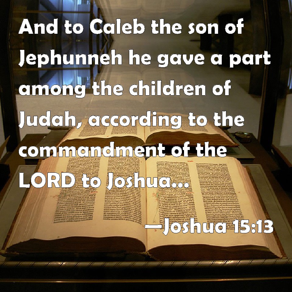 Choose a Background Joshua 15:13 And to Caleb the son of Jephunneh he gave a part among the children of Judah, according to the commandment of the LORD to Joshua, even the city of Arba the father of Anak, which city is Hebron. KJV: And unto Caleb the son of Jephunneh he gave a part among the children of Judah, according to the commandment of the LORD to Joshua, even the city of Arba the father of Anak, which city is Hebron. DRB: But to Caleb the son of Jephone he gave a portion in the midst of the children of Juda, as the Lord had commanded him: Cariath-Arbe the father of Enac. which is Hebron. DBT: And to Caleb the son of Jephunneh he gave a portion among the children of Judah according to the commandment of Jehovah to Joshua, the city of Arba, the father of Anak, that is, Hebron. ERV: And unto Caleb the son of Jephunneh he gave a portion among the children of Judah, according to the commandment of the LORD to Joshua, even Kirjath-arba, which Arba was the father of Anak (the same is Hebron). WBT: And to Caleb the son of Jephunneh he gave a part among the children of Judah, according to the commandment of the LORD to Joshua, even the city of Arba the father of Anak, which city is Hebron. WEB: To Caleb the son of Jephunneh he gave a portion among the children of Judah, according to the commandment of Yahweh to Joshua, even Kiriath Arba, named after the father of Anak (the same is Hebron). YLT: And to Caleb son of Jephunneh hath he given a portion in the midst of the sons of Judah, according to the command of Jehovah to Joshua, even the city of Arba, father of Anak — it is Hebron.Links Joshua 15:13 NIV • Joshua 15:13 NLT • Joshua 15:13 ESV • Joshua 15:13 NASB • Joshua 15:13 KJV • Joshua 15:13 Interlinear • Joshua 15:13 Commentaries • Joshua 15:13 Parallel Texts • Joshua 15:13 Bible Apps • Joshua 15:13 Parallel • Bible Hub |