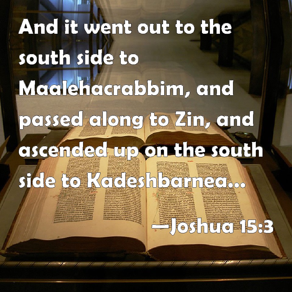 Choose a Background Joshua 15:3 And it went out to the south side to Maalehacrabbim, and passed along to Zin, and ascended up on the south side to Kadeshbarnea, and passed along to Hezron, and went up to Adar, and fetched a compass to Karkaa: KJV: And it went out to the south side to Maalehacrabbim, and passed along to Zin, and ascended up on the south side unto Kadeshbarnea, and passed along to Hezron, and went up to Adar, and fetched a compass to Karkaa: DRB: And it goeth out towards the ascent of the Scorpion, and passeth on to Sina: and ascendeth into Cadesbarne, and reacheth into Esron, going up to Addar, and compassing Carcaa. DBT: and it went out south of the ascent of Akrabbim, and passed on to Zin, and went up on the south of Kadesh-barnea, and passed to Hezron, and went up toward Addar, and turned toward Karkaah, ERV: and it went out southward of the ascent of Akrabbim, and passed along to Zin, and went up by the south of Kadesh-barnea, and passed along by Hezron, and went up to Addar, and turned about to Karka: WBT: And it went out to the south side to Maaleh-acrabbim, and passed along to Zin, and ascended on the south side to Kadesh-barnea, and passed along to Hezron, and went up to Adar, and fetched a compass to Karkaa: WEB: and it went out southward of the ascent of Akrabbim, and passed along to Zin, and went up by the south of Kadesh Barnea, and passed along by Hezron, went up to Addar, and turned about to Karka; YLT: and it hath gone out unto the south to Maaleh-Akrabbim, and passed over to Zin, and gone up on the south to Kadesh-Barnea, and passed over to Hezron, and gone up to Adar, and turned round to Karkaa,Links Joshua 15:3 NIV • Joshua 15:3 NLT • Joshua 15:3 ESV • Joshua 15:3 NASB • Joshua 15:3 KJV • Joshua 15:3 Interlinear • Joshua 15:3 Commentaries • Joshua 15:3 Parallel Texts • Joshua 15:3 Bible Apps • Joshua 15:3 Parallel • Bible Hub |