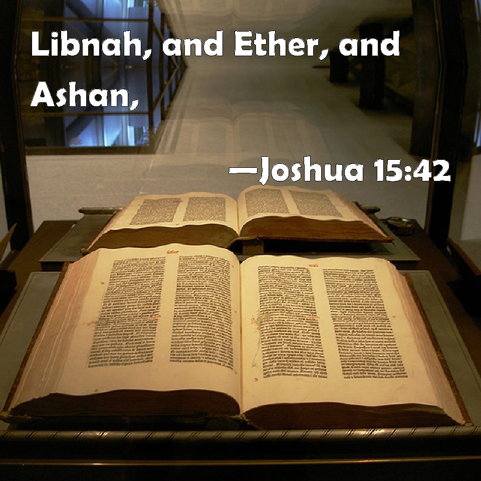 Choose a Background Joshua 15:42 Libnah, and Ether, and Ashan, KJV: Libnah, and Ether, and Ashan, DRB: Labana and Ether and Asan, DBT: Libna, and Ether, and Ashan, ERV: Libnah, and Ether, and Ashan; WBT: Libnah, and Ether, and Ashan, WEB: Libnah, Ether, Ashan, YLT: Libnah, and Ether, and Ashan,Links Joshua 15:42 NIV • Joshua 15:42 NLT • Joshua 15:42 ESV • Joshua 15:42 NASB • Joshua 15:42 KJV • Joshua 15:42 Interlinear • Joshua 15:42 Commentaries • Joshua 15:42 Parallel Texts • Joshua 15:42 Bible Apps • Joshua 15:42 Parallel • Bible Hub |