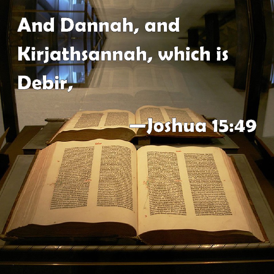 Choose a Background Joshua 15:49 And Dannah, and Kirjathsannah, which is Debir, KJV: And Dannah, and Kirjathsannah, which is Debir, DRB: And Danna and Cariath-senna, this is Dabir : DBT: and Dannah, and Kirjath-sannah, that is, Debir, ERV: and Dannah, and Kiriath-sannah (the same is Debir); WBT: And Dannah, and Kirjath-sannah, which is Debir, WEB: Dannah, Kiriath Sannah (which is Debir), YLT: and Dannah, and Kirjath-Sannah (it is Debir)Links Joshua 15:49 NIV • Joshua 15:49 NLT • Joshua 15:49 ESV • Joshua 15:49 NASB • Joshua 15:49 KJV • Joshua 15:49 Interlinear • Joshua 15:49 Commentaries • Joshua 15:49 Parallel Texts • Joshua 15:49 Bible Apps • Joshua 15:49 Parallel • Bible Hub |