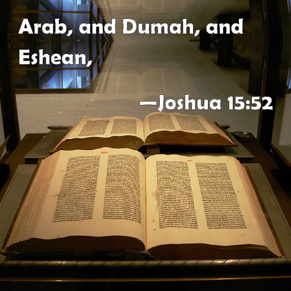 Choose a Background Joshua 15:52 Arab, and Dumah, and Eshean, KJV: Arab, and Dumah, and Eshean, DRB: Arab and Ruma and Esaan, DBT: Arab, and Dumah, and Eshan, ERV: Arab, and Dumah, and Eshan; WBT: Arab, and Dumah, and Eshean, WEB: Arab, Dumah, Eshan, YLT: Arab, and Dumah, and Eshean,Links Joshua 15:52 NIV • Joshua 15:52 NLT • Joshua 15:52 ESV • Joshua 15:52 NASB • Joshua 15:52 KJV • Joshua 15:52 Interlinear • Joshua 15:52 Commentaries • Joshua 15:52 Parallel Texts • Joshua 15:52 Bible Apps • Joshua 15:52 Parallel • Bible Hub |