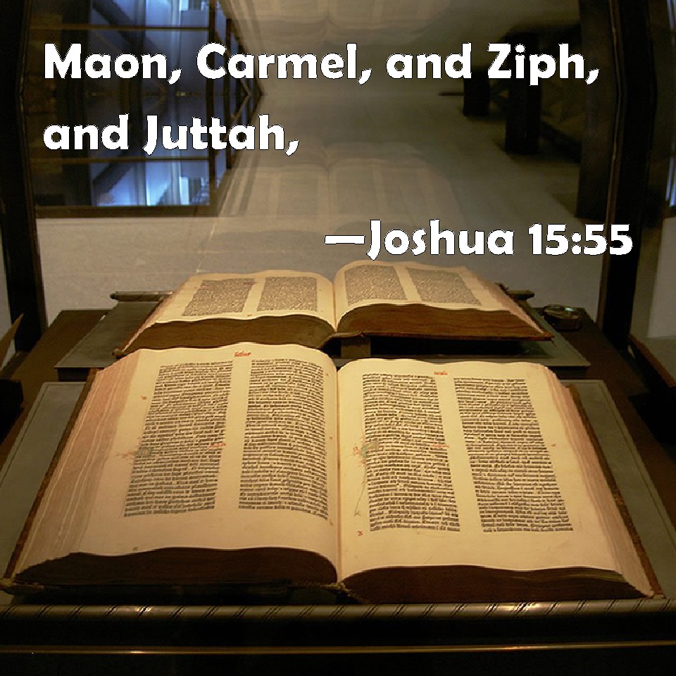 Choose a Background Joshua 15:55 Maon, Carmel, and Ziph, and Juttah, KJV: Maon, Carmel, and Ziph, and Juttah, DRB: Maon and Carmel and Ziph and Jota, DBT: Maon, Carmel, and Ziph, and Jutah, ERV: Maon, Carmel, and Ziph, and Jutah; WBT: Maon, Carmel, and Ziph, and Juttah, WEB: Maon, Carmel, Ziph, Jutah, YLT: Maon, Carmel, and Ziph, and Juttah,Links Joshua 15:55 NIV • Joshua 15:55 NLT • Joshua 15:55 ESV • Joshua 15:55 NASB • Joshua 15:55 KJV • Joshua 15:55 Interlinear • Joshua 15:55 Commentaries • Joshua 15:55 Parallel Texts • Joshua 15:55 Bible Apps • Joshua 15:55 Parallel • Bible Hub |