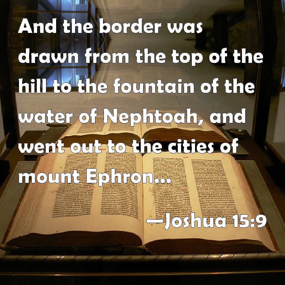 Choose a Background Joshua 15:9 And the border was drawn from the top of the hill to the fountain of the water of Nephtoah, and went out to the cities of mount Ephron; and the border was drawn to Baalah, which is Kirjathjearim: KJV: And the border was drawn from the top of the hill unto the fountain of the water of Nephtoah, and went out to the cities of mount Ephron; and the border was drawn to Baalah, which is Kirjathjearim: DRB: And it passeth on from the top of the mountain to the fountain of the water of Nephtoa: and reacheth to the towns of mount Ephron: and it bendeth towards Baala, which is Cariathiarim, that is to say, the city of the woods. DBT: and the border reached along from the top of the mountain toward the spring of the waters of Nephtoah, and went out toward the cities of mount Ephron; and the border reached along to Baalah, that is, Kirjath-jearim; ERV: and the border was drawn from the top of the mountain unto the fountain of the waters of Nephtoah, and went out to the cities of mount Ephron; and the border was drawn to Baalah (the same is Kiriath-jearim): WBT: And the border was drawn from the top of the hill to the fountain of the water of Nephtoah, and went out to the cities of mount Ephron; and the border was drawn to Baalah, which is Kirjath-jearim: WEB: The border extended from the top of the mountain to the spring of the waters of Nephtoah, and went out to the cities of Mount Ephron; and the border extended to Baalah (the same is Kiriath Jearim); YLT: and the border hath been marked out, from the top of the hill-country unto the fountain of the waters of Nephtoah, and hath gone out unto the cities of mount Ephron, and the border hath been marked out to Baalah, (it is Kirjath-Jearim);Links Joshua 15:9 NIV • Joshua 15:9 NLT • Joshua 15:9 ESV • Joshua 15:9 NASB • Joshua 15:9 KJV • Joshua 15:9 Interlinear • Joshua 15:9 Commentaries • Joshua 15:9 Parallel Texts • Joshua 15:9 Bible Apps • Joshua 15:9 Parallel • Bible Hub |