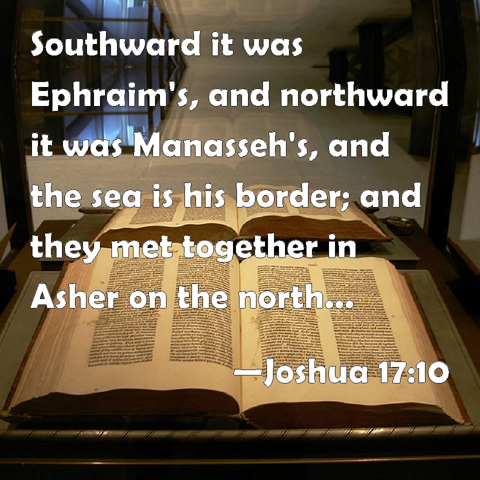 Choose a Background Joshua 17:10 Southward it was Ephraim's, and northward it was Manasseh's, and the sea is his border; and they met together in Asher on the north, and in Issachar on the east. KJV: Southward it was Ephraim's, and northward it was Manasseh's, and the sea is his border; and they met together in Asher on the north, and in Issachar on the east. DRB: So that the possession of Ephraim is on the south, and on the north that of Manasses, and the sea is the border of both, and they are joined together in the tribe of Aser on the north, and in the tribe of Issachar on the east. DBT: Southward it was Ephraim's, and northward it was Manasseh's, and the sea was his border. And they touched upon Asher on the north, and upon Issachar on the east. ERV: southward it was Ephraim's, and northward it was Manasseh's, and the sea was his border; and they reached to Asher on the north, and to Issachar on the east. WBT: Southward it was Ephraim's, and northward it was Manasseh's, and the sea is his border; and they met together in Asher on the north, and in Issachar on the east. WEB: Southward it was Ephraim's, and northward it was Manasseh's, and the sea was his border. They reached to Asher on the north, and to Issachar on the east. YLT: Southward is to Ephraim and northward to Manasseh, and the sea is his border, and in Asher they meet on the north, and in Issachar on the east.Links Joshua 17:10 NIV • Joshua 17:10 NLT • Joshua 17:10 ESV • Joshua 17:10 NASB • Joshua 17:10 KJV • Joshua 17:10 Interlinear • Joshua 17:10 Commentaries • Joshua 17:10 Parallel Texts • Joshua 17:10 Bible Apps • Joshua 17:10 Parallel • Bible Hub |