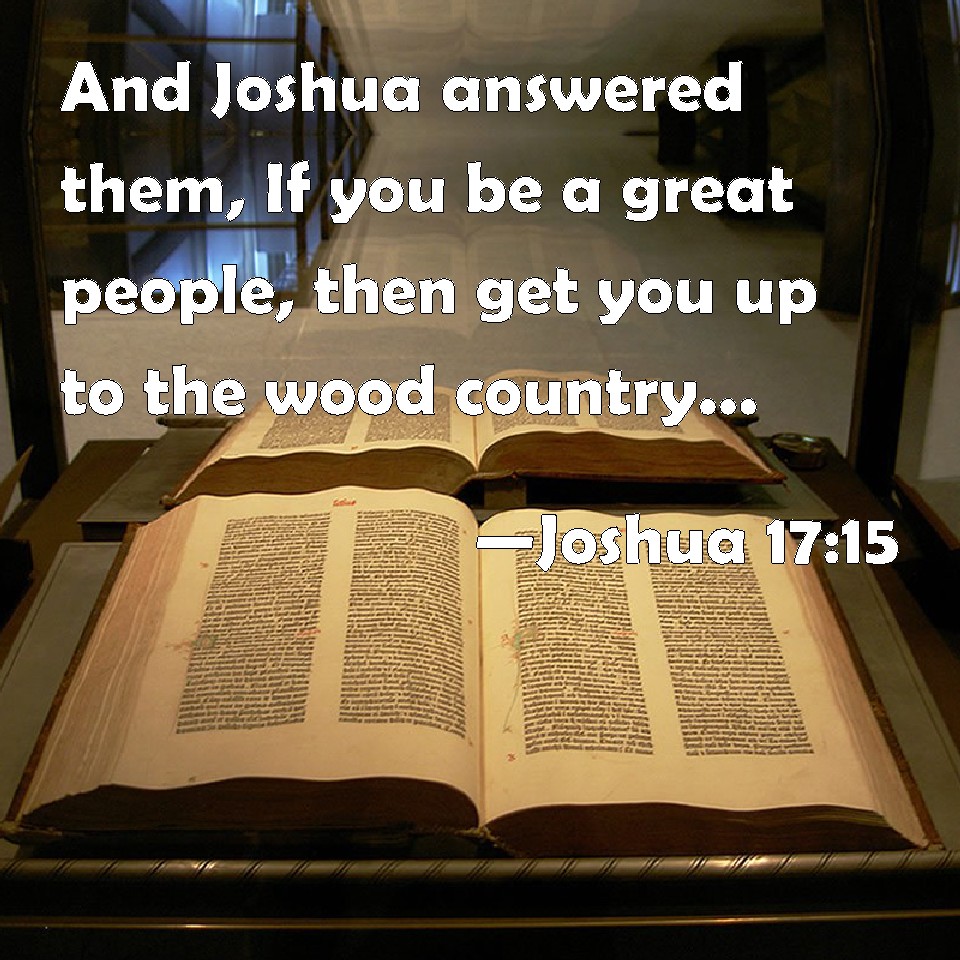 Choose a Background Joshua 17:15 And Joshua answered them, If you be a great people, then get you up to the wood country, and cut down for yourself there in the land of the Perizzites and of the giants, if mount Ephraim be too narrow for you. KJV: And Joshua answered them, If thou be a great people, then get thee up to the wood country, and cut down for thyself there in the land of the Perizzites and of the giants, if mount Ephraim be too narrow for thee. DRB: And Josue said to them: If thou be a great people, go up into the woodland, and cut down room for thyself in the land of the Pherezite and the Raphaims: because the possession of mount Ephraim is too narrow for thee. DBT: And Joshua said unto them, If thou art a great people, then get thee up to the wood, and cut down for thyself there in the land of the Perizzites and of the giants, if the hill-country of Ephraim is too narrow for thee. ERV: And Joshua said unto them, If thou be a great people, get thee up to the forest, and cut down for thyself there in the land of the Perizzites and of the Rephaim; since the hill country of Ephraim is too narrow for thee. WBT: And Joshua answered them, If thou art a great people, then go up to the wood, and cut down for thyself there in the land of the Perizzites and of the giants, if mount Ephraim is too narrow for thee. WEB: Joshua said to them, "If you are a great people, go up to the forest, and clear land for yourself there in the land of the Perizzites and of the Rephaim; since the hill country of Ephraim is too narrow for you." YLT: And Joshua saith unto them, 'If thou art a numerous people, go up for thee to the forest, then thou hast prepared for thee there, in the land of the Perizzite, and of the Rephaim, when mount Ephraim hath been narrow for thee.'Links Joshua 17:15 NIV • Joshua 17:15 NLT • Joshua 17:15 ESV • Joshua 17:15 NASB • Joshua 17:15 KJV • Joshua 17:15 Interlinear • Joshua 17:15 Commentaries • Joshua 17:15 Parallel Texts • Joshua 17:15 Bible Apps • Joshua 17:15 Parallel • Bible Hub |