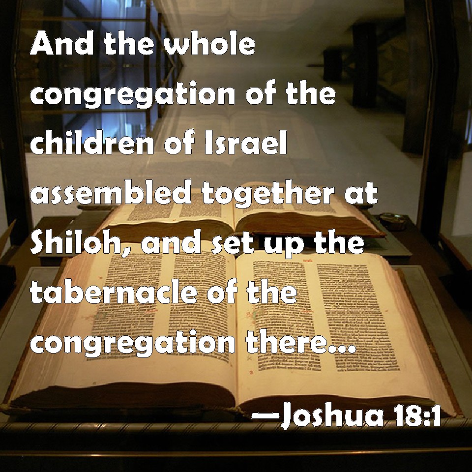 Choose a Background Joshua 18:1 And the whole congregation of the children of Israel assembled together at Shiloh, and set up the tabernacle of the congregation there. And the land was subdued before them. KJV: And the whole congregation of the children of Israel assembled together at Shiloh, and set up the tabernacle of the congregation there. And the land was subdued before them. DRB: And all the children of Israel assembled together in Silo, and there they set up the tabernacle of the testimony, and the land was subdued before them. DBT: And the whole assembly of the children of Israel gathered together at Shiloh, and set up the tent of meeting there; and the land was subdued before them. ERV: And the whole congregation of the children of Israel assembled themselves together at Shiloh, and set up the tent of meeting there: and the land was subdued before them. WBT: And the whole congregation of the children of Israel assembled at Shiloh, and set up the tabernacle of the congregation there: and the land was subdued before them. WEB: The whole congregation of the children of Israel assembled themselves together at Shiloh, and set up the Tent of Meeting there. The land was subdued before them. YLT: And all the company of the sons of Israel are assembled at Shiloh, and they cause the tent of meeting to tabernacle there, and the land hath been subdued before them.Links Joshua 18:1 NIV • Joshua 18:1 NLT • Joshua 18:1 ESV • Joshua 18:1 NASB • Joshua 18:1 KJV • Joshua 18:1 Interlinear • Joshua 18:1 Commentaries • Joshua 18:1 Parallel Texts • Joshua 18:1 Bible Apps • Joshua 18:1 Parallel • Bible Hub |