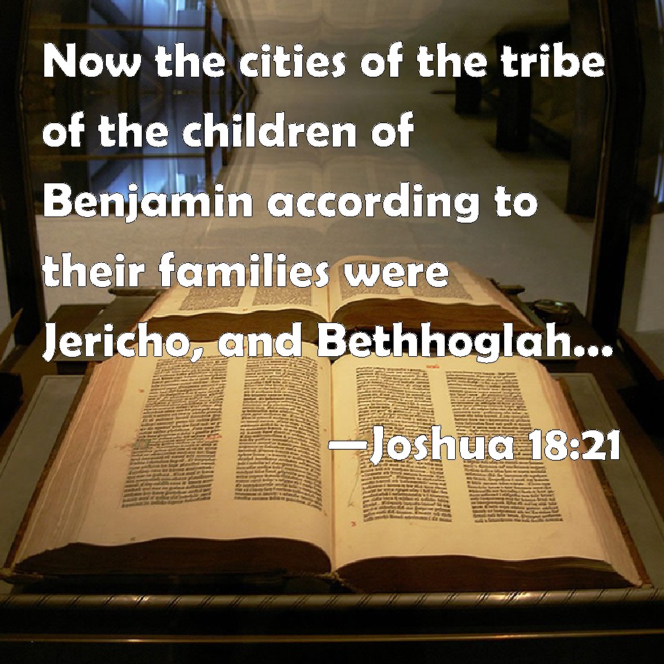 Choose a Background Joshua 18:21 Now the cities of the tribe of the children of Benjamin according to their families were Jericho, and Bethhoglah, and the valley of Keziz, KJV: Now the cities of the tribe of the children of Benjamin according to their families were Jericho, and Bethhoglah, and the valley of Keziz, DRB: And their cities were, Jericho and Bethhagla and Vale-Casis, DBT: And the cities of the tribe of the children of Benjamin according to their families were: Jericho, and Beth-hoglah, and Emek-Keziz, ERV: Now the cities of the tribe of the children of Benjamin according to their families were Jericho, and Beth-hoglah, and Emek-keziz; WBT: Now the cities of the tribe of the children of Benjamin, according to their families, were Jericho, and Beth-hoglah, and the valley of Keziz, WEB: Now the cities of the tribe of the children of Benjamin according to their families were Jericho, Beth Hoglah, Emek Keziz, YLT: And the cities for the tribe of the sons of Benjamin, for their families, have been Jericho, and Beth-Hoglah, and the valley of Keziz,Links Joshua 18:21 NIV • Joshua 18:21 NLT • Joshua 18:21 ESV • Joshua 18:21 NASB • Joshua 18:21 KJV • Joshua 18:21 Interlinear • Joshua 18:21 Commentaries • Joshua 18:21 Parallel Texts • Joshua 18:21 Bible Apps • Joshua 18:21 Parallel • Bible Hub |