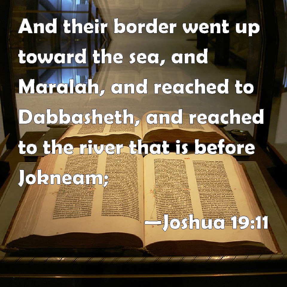 Choose a Background Joshua 19:11 And their border went up toward the sea, and Maralah, and reached to Dabbasheth, and reached to the river that is before Jokneam; KJV: And their border went up toward the sea, and Maralah, and reached to Dabbasheth, and reached to the river that is before Jokneam; DRB: And it went up from the sea and from Merala, and came to Debbaseth: as far as the torrent, which is over against Jeconam. DBT: and their border went up westwards, and to Marealah, and reached to Dabbesheth, and reached to the torrent that is before Jokneam; ERV: and their border went up westward, even to Maralah, and reached to Dabbesheth; and it reached to the brook that is before Jokneam; WBT: And their border went up towards the sea, and Maralah, and reached to Dabbasheth, and reached to the river that is before Jokneam, WEB: Their border went up westward, even to Maralah, and reached to Dabbesheth. It reached to the brook that is before Jokneam. YLT: and their border hath gone up towards the sea, and Maralah, and come against Dabbasheth, and come unto the brook which is on the front of Jokneam,Links Joshua 19:11 NIV • Joshua 19:11 NLT • Joshua 19:11 ESV • Joshua 19:11 NASB • Joshua 19:11 KJV • Joshua 19:11 Interlinear • Joshua 19:11 Commentaries • Joshua 19:11 Parallel Texts • Joshua 19:11 Bible Apps • Joshua 19:11 Parallel • Bible Hub |