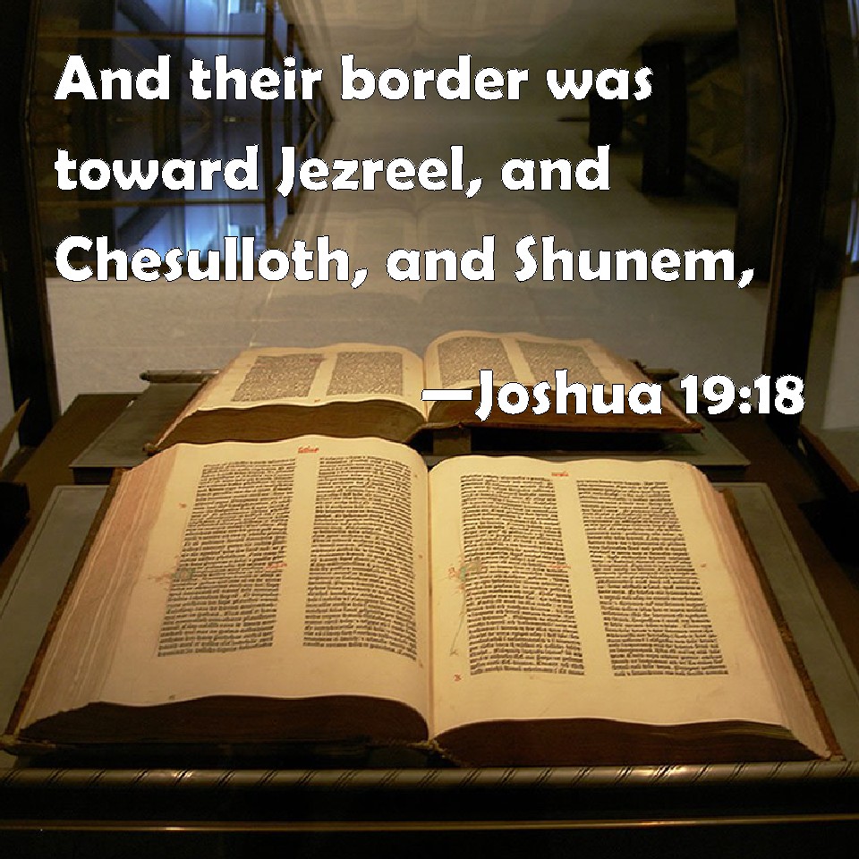 Choose a Background Joshua 19:18 And their border was toward Jezreel, and Chesulloth, and Shunem, KJV: And their border was toward Jezreel, and Chesulloth, and Shunem, DRB: And his inheritance was Jezrael and Casaloth and Sunem, DBT: And their territory was toward Jizreel, and Chesulloth, and Shunem, ERV: And their border was unto Jezreel, and Chesulloth, and Shunem; WBT: And their border was towards Jezreel, and Chesulloth, and Shunem, WEB: Their border was to Jezreel, Chesulloth, Shunem, YLT: and their border is at Jezreel, and Chesulloth, and Shunem,Links Joshua 19:18 NIV • Joshua 19:18 NLT • Joshua 19:18 ESV • Joshua 19:18 NASB • Joshua 19:18 KJV • Joshua 19:18 Interlinear • Joshua 19:18 Commentaries • Joshua 19:18 Parallel Texts • Joshua 19:18 Bible Apps • Joshua 19:18 Parallel • Bible Hub |