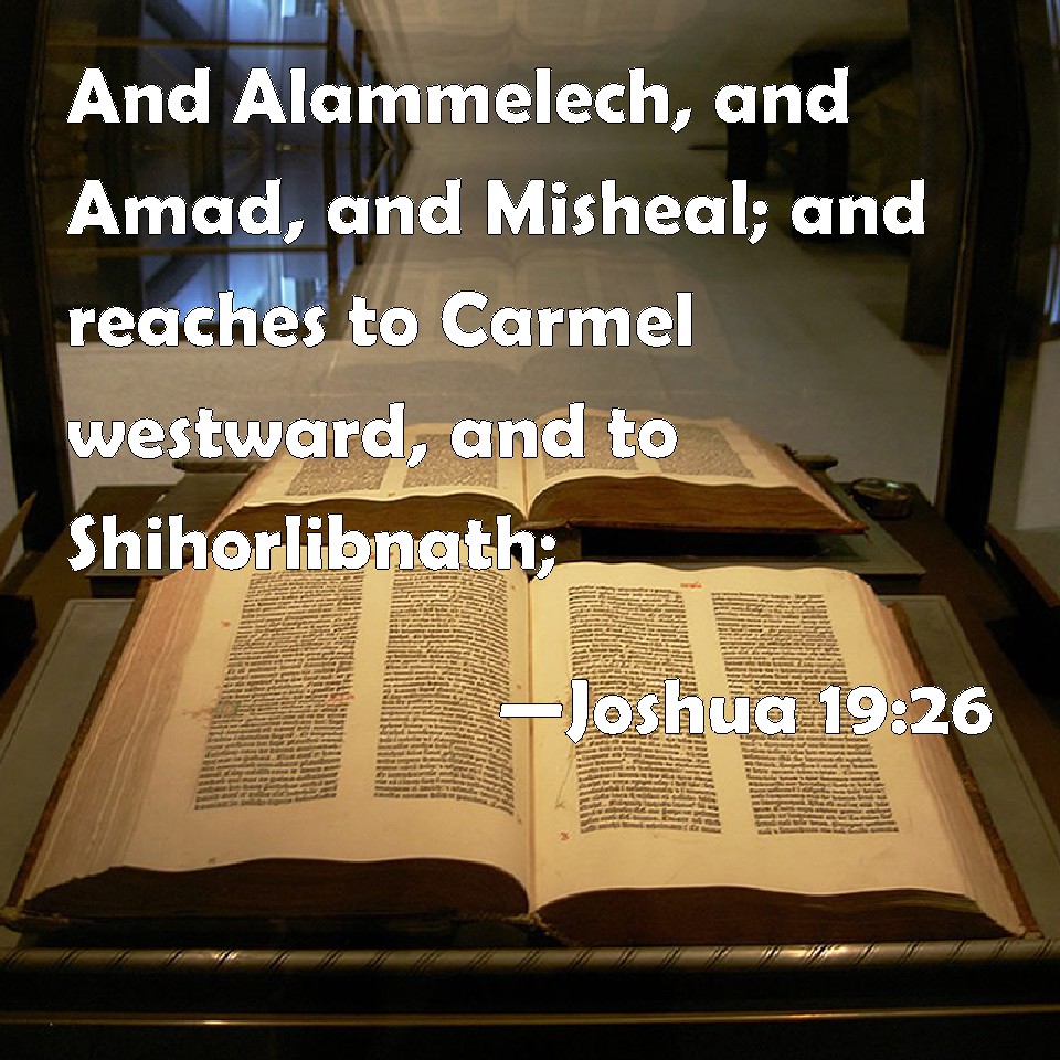 Choose a Background Joshua 19:26 And Alammelech, and Amad, and Misheal; and reaches to Carmel westward, and to Shihorlibnath; KJV: And Alammelech, and Amad, and Misheal; and reacheth to Carmel westward, and to Shihorlibnath; DRB: And Elmelech and Amaad and Messal: and it reacheth to Carmel by the sea and Sihor and Labanath, DBT: and Allammelech, and Amead, and Mishal; and the border reached to Carmel westwards, and to Shihor-libnath, ERV: and Allammelech, and Amad, and Mishal; and it reached to Carmel westward, and to Shihor-libnath; WBT: And Alammelech, and Amad, and Misheal; and reacheth to Carmel westward, and to Shihor-libnath; WEB: Allammelech, Amad, Mishal. It reached to Carmel westward, and to Shihorlibnath. YLT: and Alammelech, and Amad, and Misheal; and it toucheth against Carmel westward, and against Shihor-Libnath;Links Joshua 19:26 NIV • Joshua 19:26 NLT • Joshua 19:26 ESV • Joshua 19:26 NASB • Joshua 19:26 KJV • Joshua 19:26 Interlinear • Joshua 19:26 Commentaries • Joshua 19:26 Parallel Texts • Joshua 19:26 Bible Apps • Joshua 19:26 Parallel • Bible Hub |