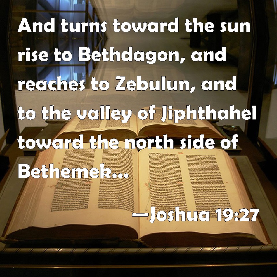 Choose a Background Joshua 19:27 And turns toward the sun rise to Bethdagon, and reaches to Zebulun, and to the valley of Jiphthahel toward the north side of Bethemek, and Neiel, and goes out to Cabul on the left hand, KJV: And turneth toward the sunrising to Bethdagon, and reacheth to Zebulun, and to the valley of Jiphthahel toward the north side of Bethemek, and Neiel, and goeth out to Cabul on the left hand, DRB: And it returneth towards the east to Bethdagon: and passeth along to Zabulon and to the valley of Jephthael towards the north to Bethemec and Nehiel. And it goeth out to the left side of Cabul, DBT: and turned towards the sun-rising to Beth-Dagon, and reached to Zebulun, and to the valley of Jiphthah-el northward to Beth-emek and Neiel, and went out to Cabul on the left, ERV: and it turned toward the sunrising to Beth-dagon, and reached to Zebulun, and to the valley of Iphtah-el northward to Beth-emek and Neiel; and it went out to Cabul on the left hand, WBT: And turneth towards the sun-rising to Beth-dagon, and reacheth to Zebulun, and to the valley of Jiphthah-el towards the north side of Beth-emek, and Neiel, and goeth out to Cabul on the left hand, WEB: It turned toward the sunrise to Beth Dagon, and reached to Zebulun, and to the valley of Iphtah El northward to Beth Emek and Neiel. It went out to Cabul on the left hand, YLT: and hath turned back, at the sun-rising, to Beth-Dagon, and come against Zebulun, and against the valley of Jiphthah-El toward the north of Beth-Emek, and Neiel, and hath gone out unto Cabul on the left,Links Joshua 19:27 NIV • Joshua 19:27 NLT • Joshua 19:27 ESV • Joshua 19:27 NASB • Joshua 19:27 KJV • Joshua 19:27 Interlinear • Joshua 19:27 Commentaries • Joshua 19:27 Parallel Texts • Joshua 19:27 Bible Apps • Joshua 19:27 Parallel • Bible Hub |