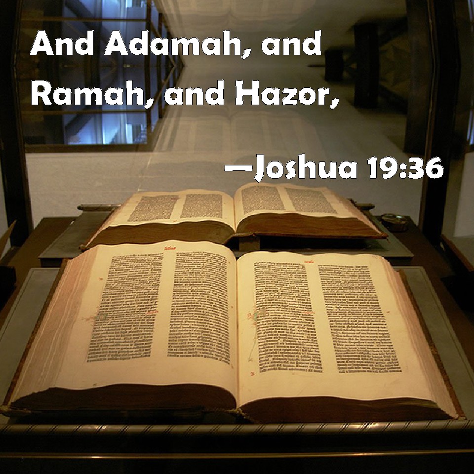 Choose a Background Joshua 19:36 And Adamah, and Ramah, and Hazor, KJV: And Adamah, and Ramah, and Hazor, DRB: And Edema and Arama, Asor, DBT: and Adamah, and Ramah, and Hazor, ERV: and Adamah, and Ramah, and Hazor; WBT: And Adamah, and Ramah, and Hazor, WEB: Adamah, Ramah, Hazor, YLT: and Adamah, and Ramah, and Hazor,Links Joshua 19:36 NIV • Joshua 19:36 NLT • Joshua 19:36 ESV • Joshua 19:36 NASB • Joshua 19:36 KJV • Joshua 19:36 Interlinear • Joshua 19:36 Commentaries • Joshua 19:36 Parallel Texts • Joshua 19:36 Bible Apps • Joshua 19:36 Parallel • Bible Hub |