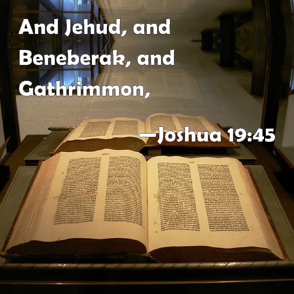 Choose a Background Joshua 19:45 And Jehud, and Beneberak, and Gathrimmon, KJV: And Jehud, and Beneberak, and Gathrimmon, DRB: And Jud and Bane and Barach and Gethremmon : DBT: and Jehud, and Beneberak, and Gath-Rimmon, ERV: and Jehud, and Bene-berak, and Gath-rimmon; WBT: And Jehud, and Bene-berak, and Gath-rimmon, WEB: Jehud, Bene Berak, Gath Rimmon, YLT: and Jehud, and Bene-Barak, and Gath-Rimmon,Links Joshua 19:45 NIV • Joshua 19:45 NLT • Joshua 19:45 ESV • Joshua 19:45 NASB • Joshua 19:45 KJV • Joshua 19:45 Interlinear • Joshua 19:45 Commentaries • Joshua 19:45 Parallel Texts • Joshua 19:45 Bible Apps • Joshua 19:45 Parallel • Bible Hub |
